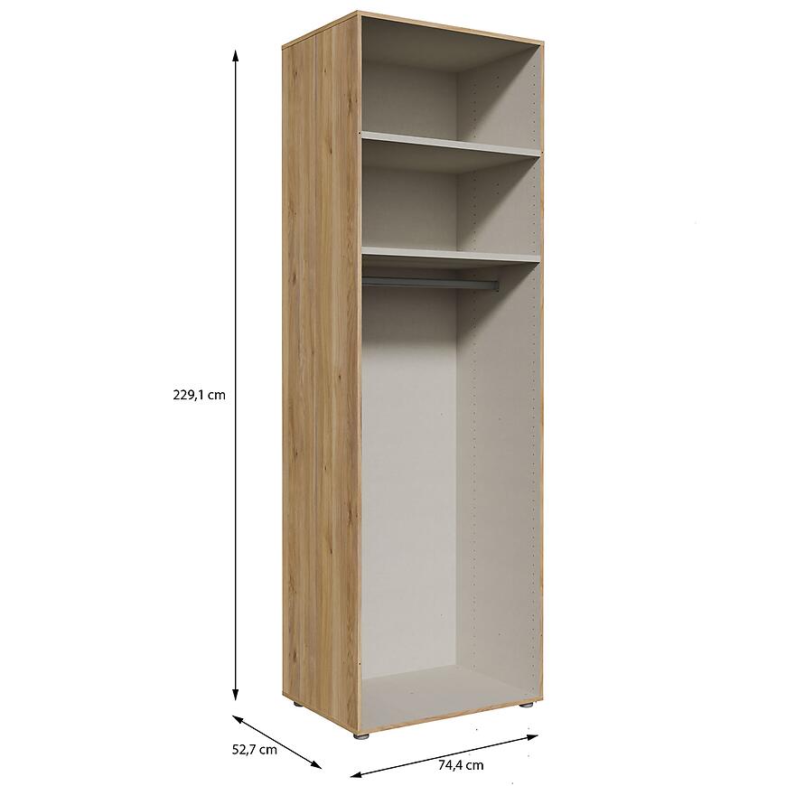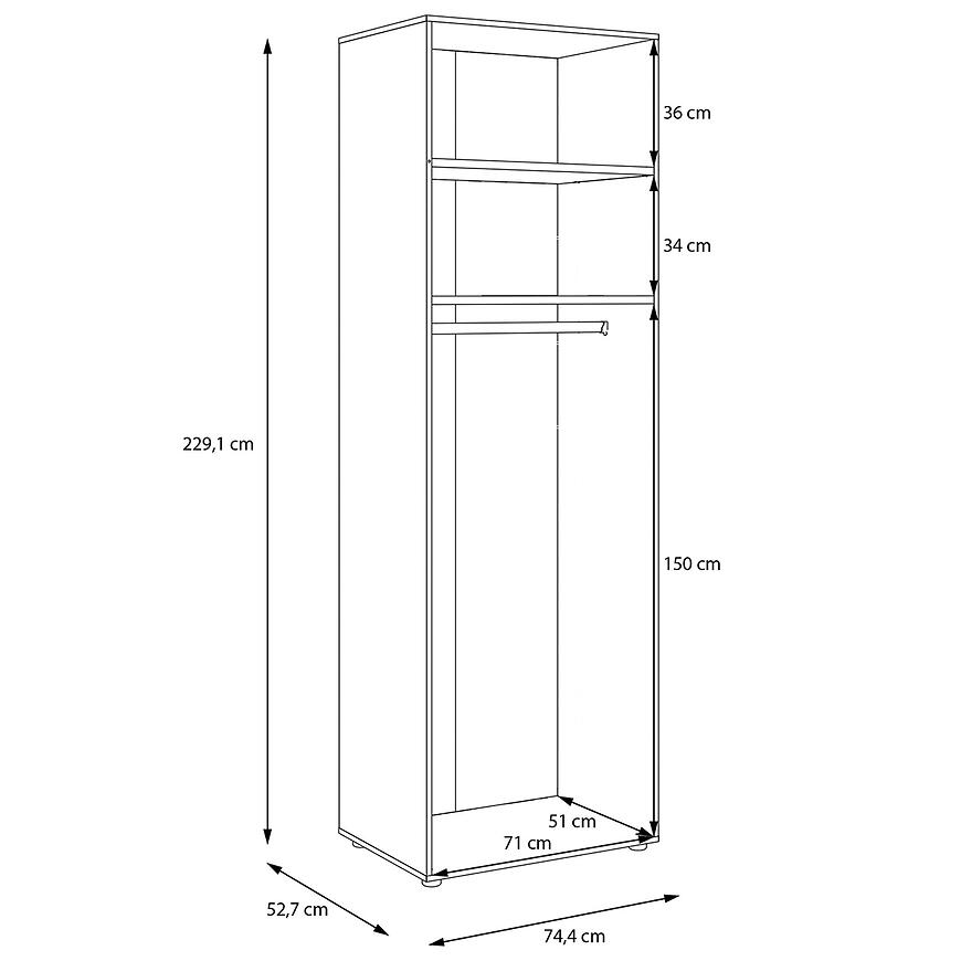 Dzięki szerokości 74,4 cm, wysokości 230,1 cm oraz głębokości 52,7 cm, mebel oferuje dużą przestrzeń do przechowywania ubrań i dodatków. Konstrukcja z płyty wiórowej laminowanej zapewnia trwałość i odporność na codzienne użytkowanie. Waga 44,3 kg wpływa na stabilność i solidność całej bryły.