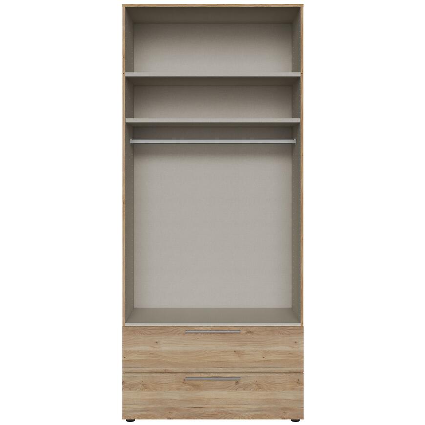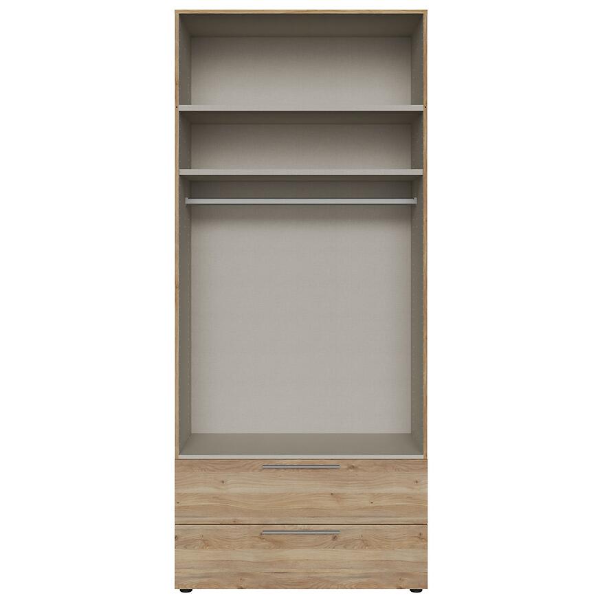 Matowe wykończenie w odcieniu dąb mouvella nadaje szafie naturalny wygląd i ułatwia dopasowanie do różnych stylów wnętrz. Korpus można rozbudować o szuflady dostępne za dopłatą, co pozwala lepiej zorganizować przestrzeń i dopasować szafę do indywidualnych potrzeb.