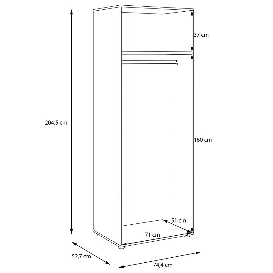 Korpus Szafy Modulix to praktyczne rozwiązanie do nowoczesnych wnętrz, które łączy funkcjonalność z estetyką. Szafa ma wysokość 204,5 cm, szerokość 49,7 cm i głębokość 52,7 cm, dzięki czemu oferuje przestrzeń wystarczającą do przechowywania ubrań, dodatków i innych przedmiotów domowego użytku. Wykonana z płyty wiórowej laminowanej o matowym wykończeniu w kolorze białym, szafa wyróżnia się trwałością i łatwością utrzymania w czystości.