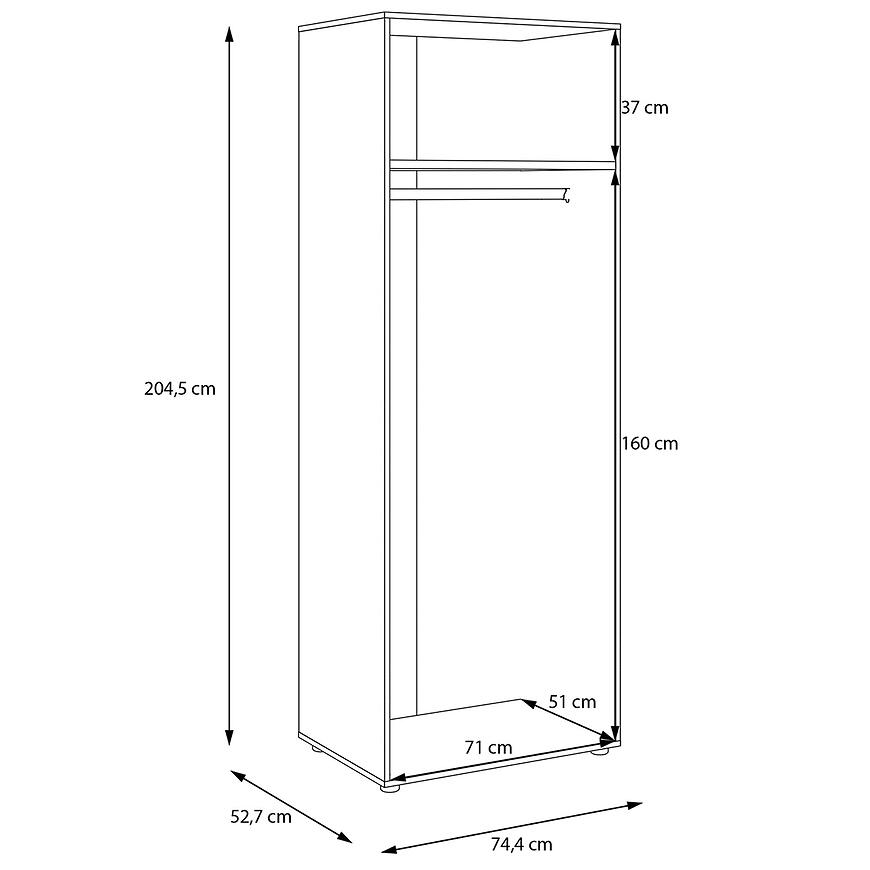 Korpus Szafy Modulix to praktyczne rozwiązanie do nowoczesnych wnętrz, które łączy funkcjonalność z estetyką. Szafa ma wysokość 204,5 cm, szerokość 74,4 cm i głębokość 52,7 cm, dzięki czemu oferuje przestrzeń wystarczającą do przechowywania ubrań, dodatków i innych przedmiotów domowego użytku. Wykonana z płyty wiórowej laminowanej o matowym wykończeniu w kolorze białym, szafa wyróżnia się trwałością i łatwością utrzymania w czystości.