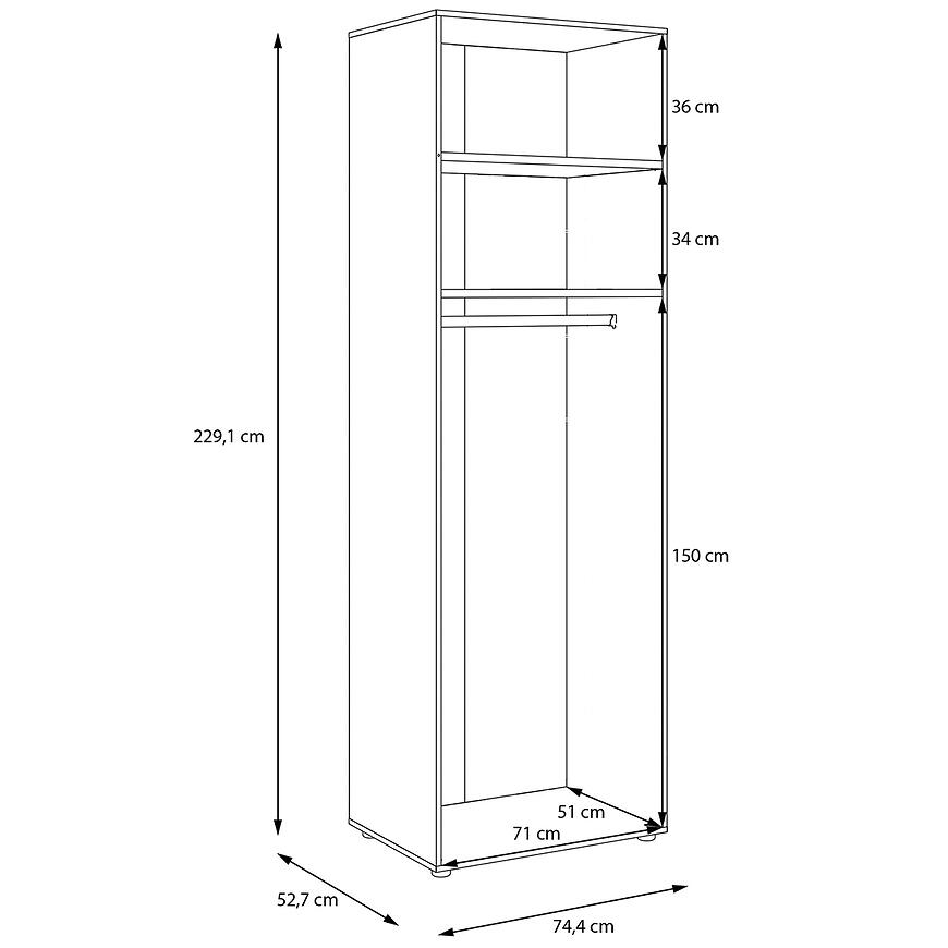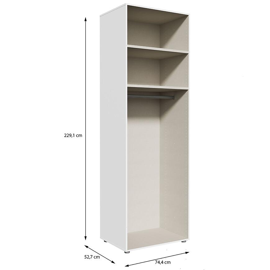 Korpus Szafy Modulix to praktyczne rozwiązanie do nowoczesnych wnętrz, które łączy funkcjonalność z estetyką. Szafa ma wysokość 230,1 cm, szerokość 74,4 cm i głębokość 52,7 cm, dzięki czemu oferuje przestrzeń wystarczającą do przechowywania ubrań, dodatków i innych przedmiotów domowego użytku. Wykonana z płyty wiórowej laminowanej o matowym wykończeniu w kolorze białym, szafa wyróżnia się trwałością i łatwością utrzymania w czystości.