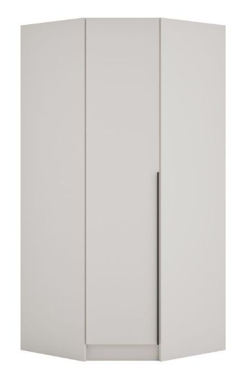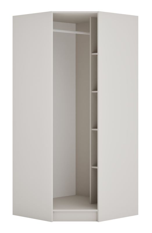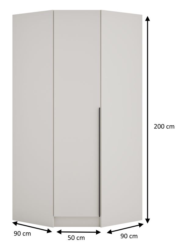 W kolekcji dostępne są moduły o szerokościach 50 cm, 100 cm oraz 150 cm, a także szafa narożna, która umożliwia praktyczne zagospodarowanie trudnych do ustawienia kątów. Standardowa wysokość 200 cm sprawdza się w typowych mieszkaniach, gdzie istotne jest zachowanie proporcji między meblem a wysokością pomieszczenia.