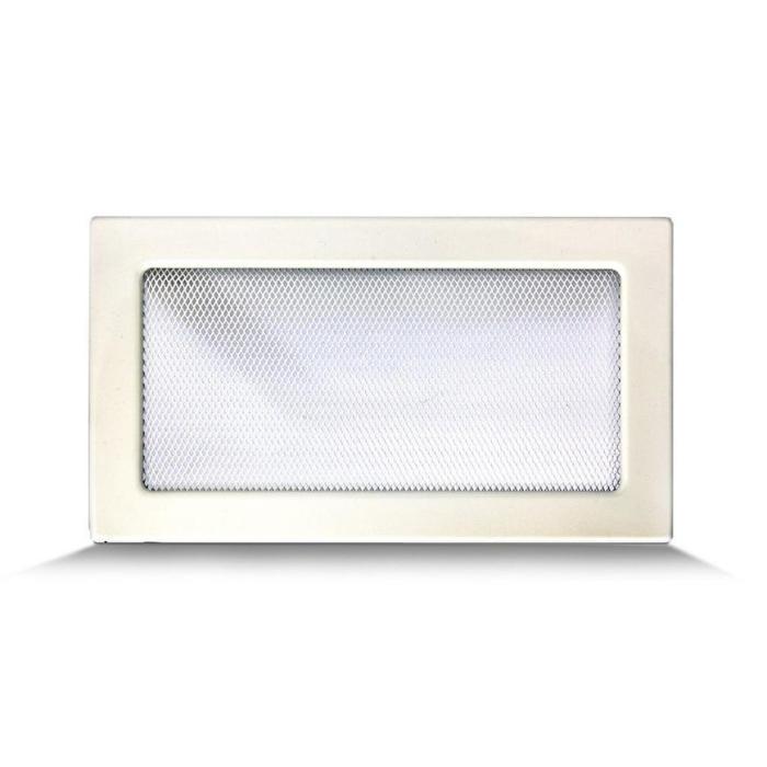 Kratka kominkowa wykonana ze stali w kolorze białym, max temperatura powietrza to 180°C. Wymiar zewnętrznych 170x300 mm, a wymiar ramy i kasety wynosi 150x280 mm.