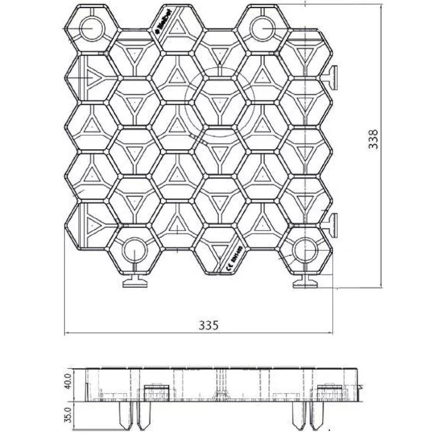 Kratka trawnikowo-drogowa składa się z systemu komor, tworzących w zarysie zespoł sześciennych struktur. Posiada zaczepy łączeniowe, służące do montażu w układ tworzący jednolitą powierzchnię stabilną w poziomie i w pionie. Wykonana z polietylenu o dużej gęstości o symbolu HDPE, uzyskiwanego rownież z procesu recyklingu odpadu tworzyw sztucznych.