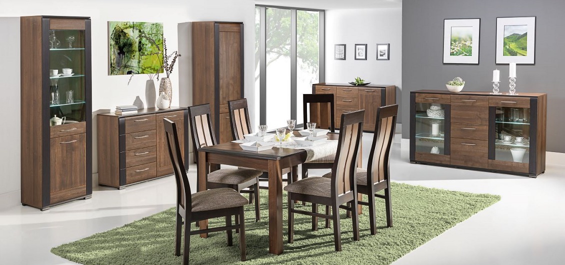 Kolekcja Naomi to połączenie klasycznej elegancji i funkcjonalności, które doskonale sprawdzi się zarówno w pokoju dziennym, jak i sypialni. Meble wykonane są z wysokiej jakości płyty laminowanej, a ich korpusy i fronty utrzymane w ciepłym kolorze orzecha podkreślają ponadczasowy styl wnętrza. Matowe wykończenie nadaje im subtelnej elegancji, a ozdobne, delikatnie zaokrąglone listwy w odcieniu wenge dodają wyjątkowego charakteru.