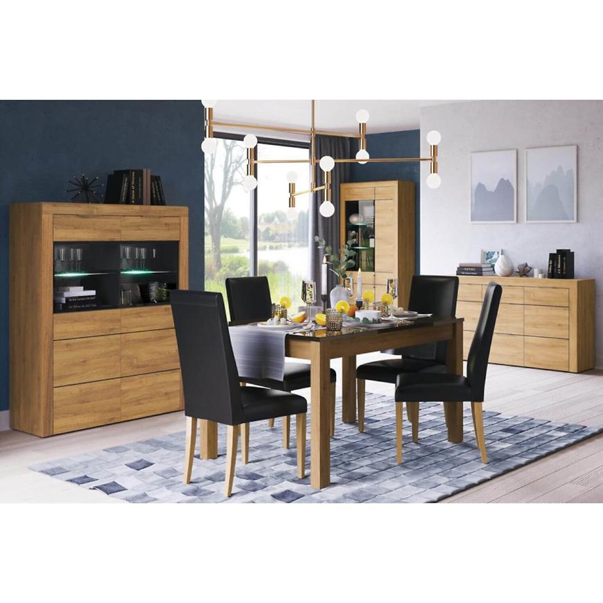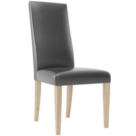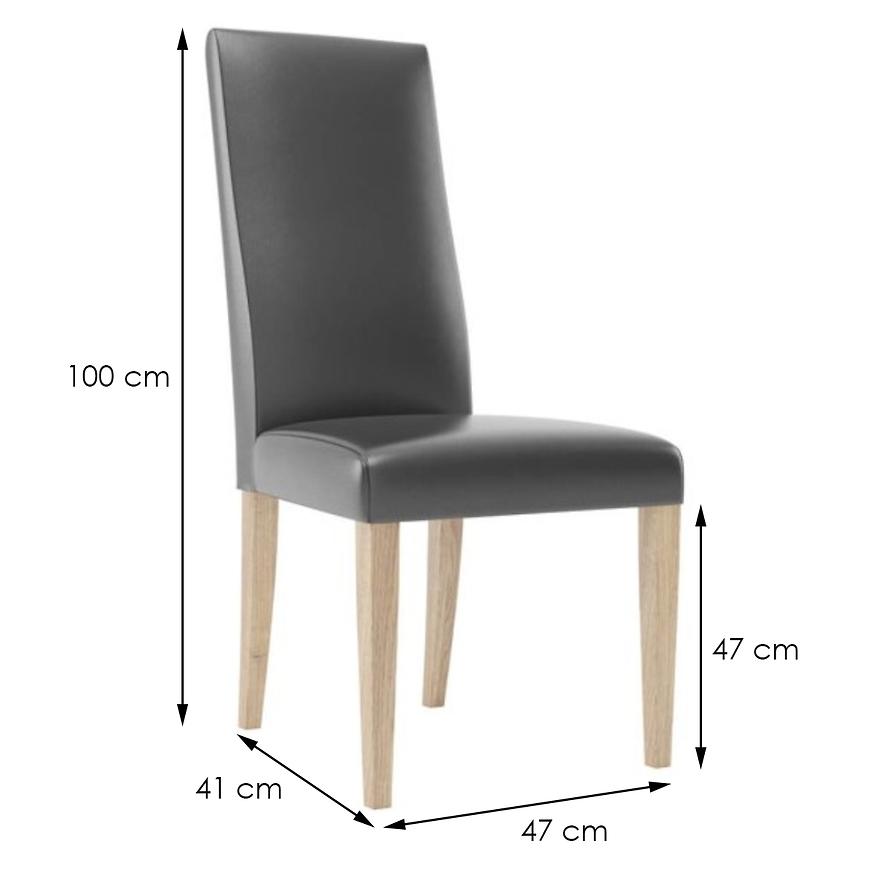 Stelaż krzesła wykonany z solidnego drewna w kolorze dębu camargue zapewnia nie tylko stabilność, ale również naturalny i ciepły wygląd. Kontrastujące z nim siedzisko w kolorze czarnym, wypełnione pianką i tapicerowane ekoskórą, dodaje krzesłu elegancji oraz łatwości w utrzymaniu czystości.