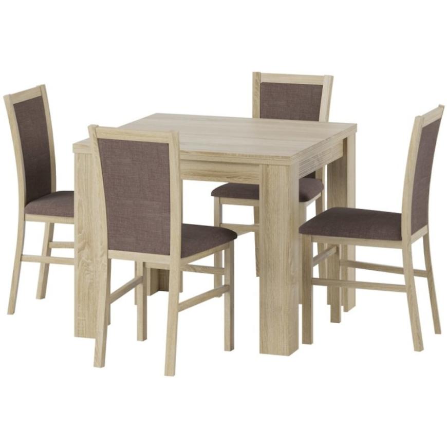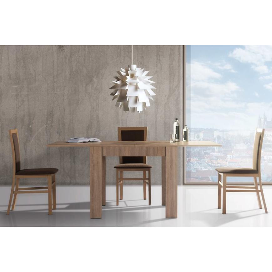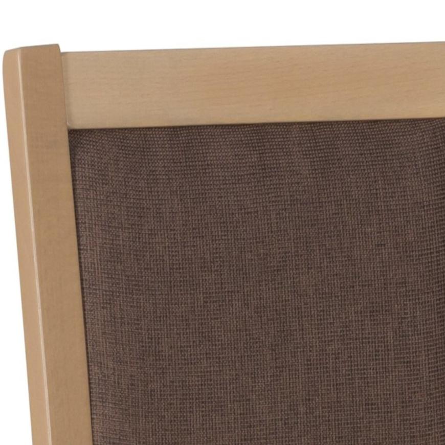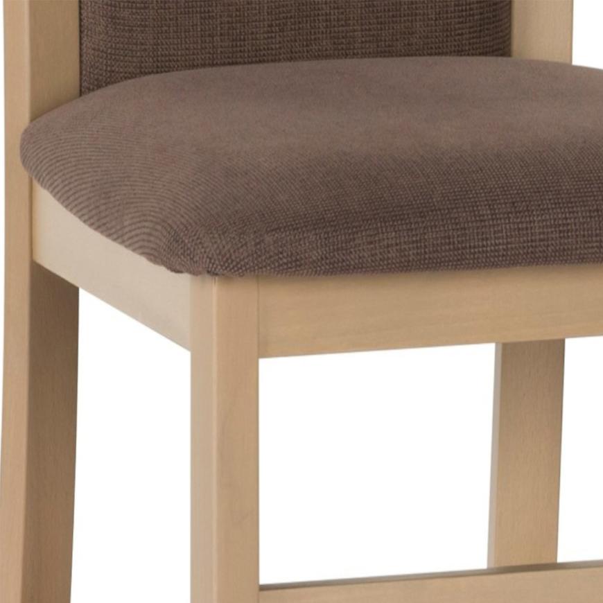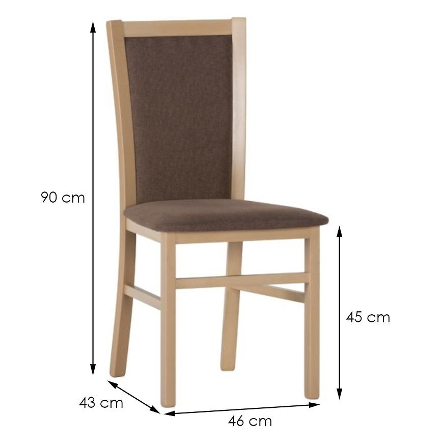 Stelaż krzesła wykonany z drewna w kolorze dąb sonoma nadaje mu naturalny i ciepły wygląd, jednocześnie zapewniając stabilność i trwałość. Kontrastujące z nim brązowe siedzisko, tapicerowane tkaniną i wypełnione pianką, dodaje krzesłu elegancji oraz wygody.