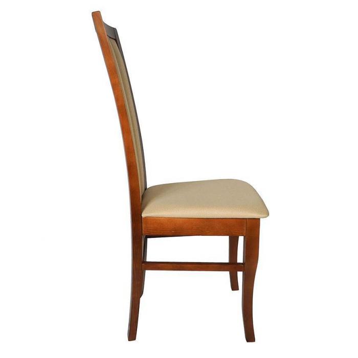Krzesło tapicerowane, które idealnie wpasuje się w jadalnie, pokój dzienny lub inne pomieszczenie. Krzesło wniesie do wnętrza elegancję oraz ciekawy wygląd. Dzięki swojej kolorystyce skomponuje się z większością aranżacji. Siedzisko krzesła zostało pokryte tkaniną, natomiast wypełnienie pianką zapewni komfort użytkowania. Całość została umieszczona na stabilnym, drewnianym stelażu w kolorze brązowym. Wysokość do siedziska 45 cm.