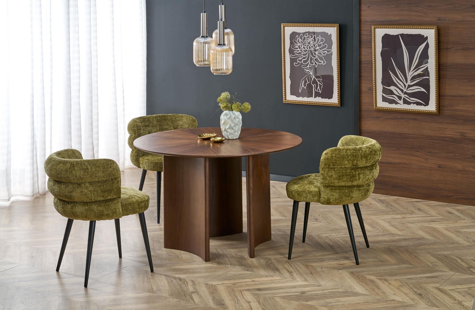 Siedzisko i oparcie krzesła 575 Merlo pokryte są wysokiej jakości tkaniną CREMONA w głębokim oliwkowym odcieniu. Tapicerka jest przyjemna w dotyku, odporna na przetarcia i łatwa w utrzymaniu w czystości. Ergonomiczny kształt siedziska zapewnia wygodę nawet podczas długiego siedzenia, a kolor oliwkowy wprowadza do wnętrza elegancję i nowoczesny charakter.