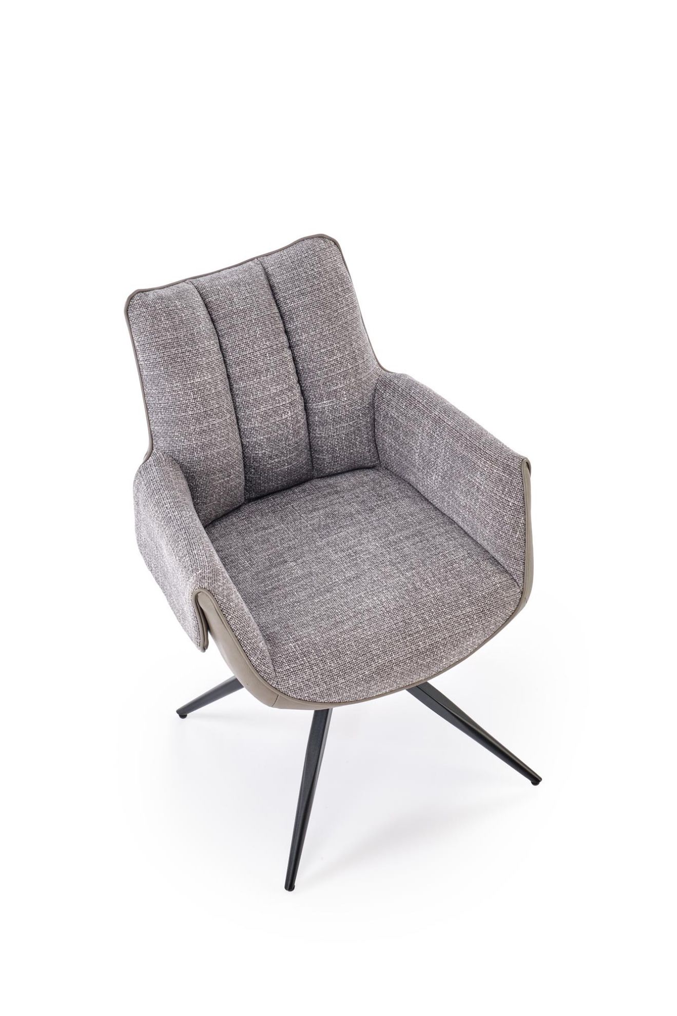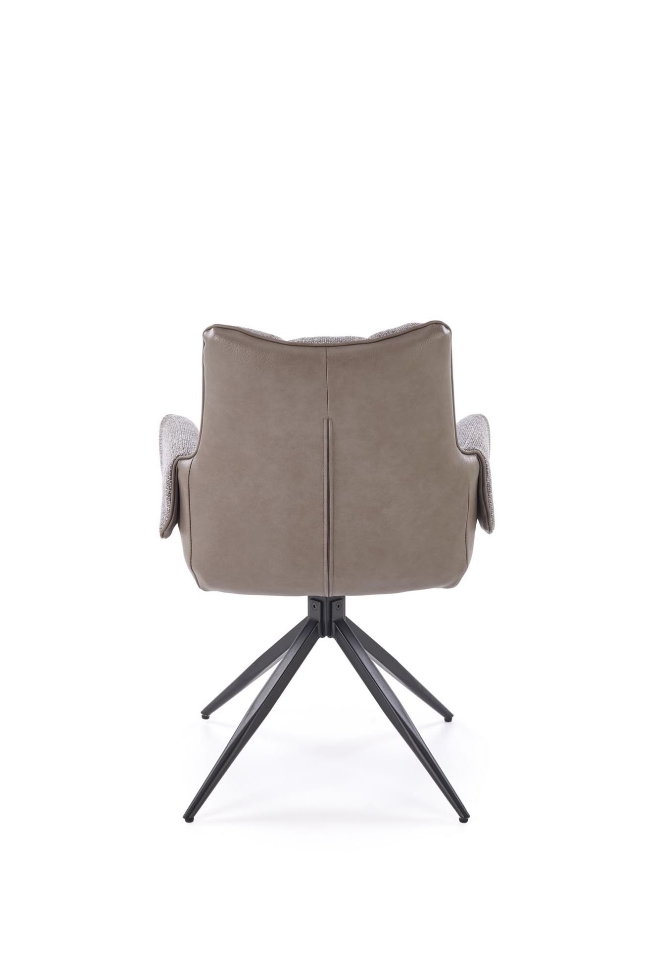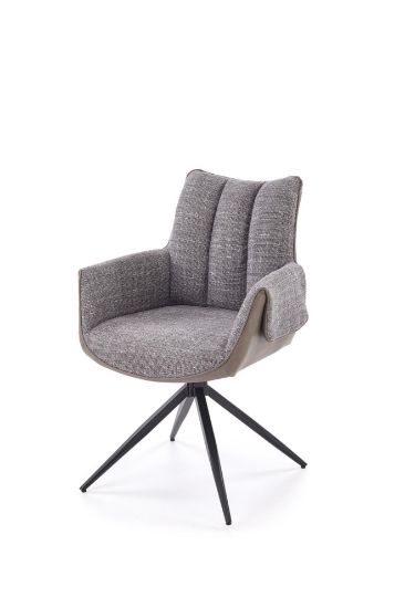 Siedzisko i oparcie krzesła 579 Domeno pokryte są połączeniem tkaniny oraz eco skóry w popielatym odcieniu. Zastosowane materiały są estetyczne, przyjemne w użytkowaniu i łatwe w utrzymaniu czystości. Popielata tapicerka nadaje krzesłu elegancki, stonowany wygląd, który doskonale komponuje się z czarnym metalowym stelażem.