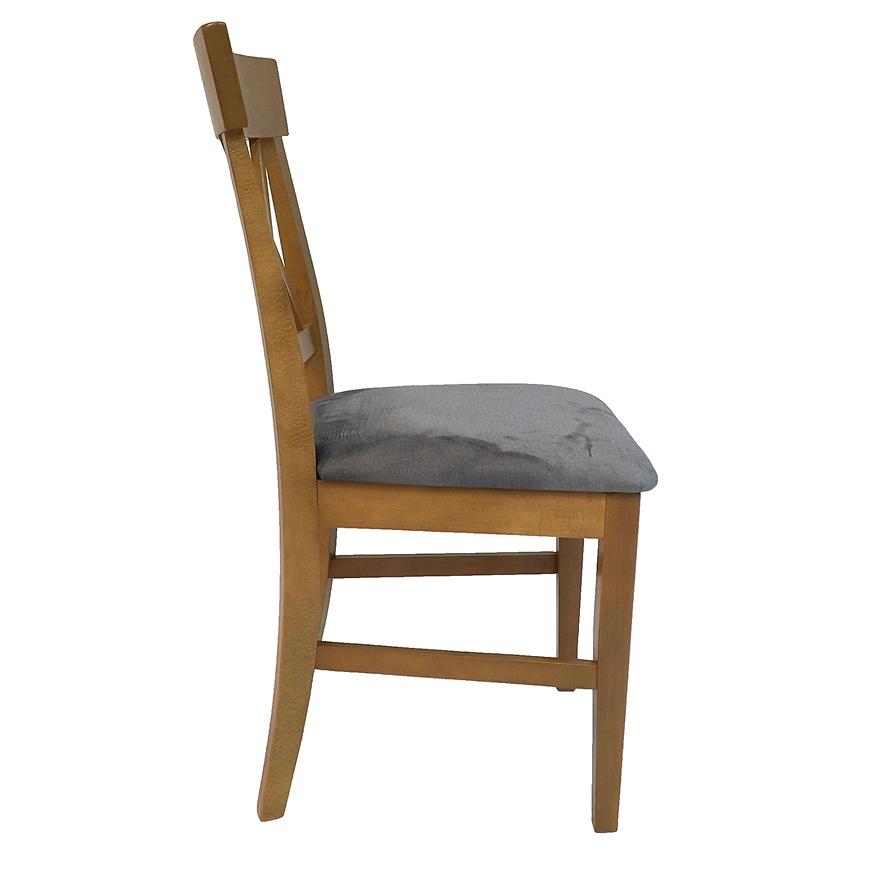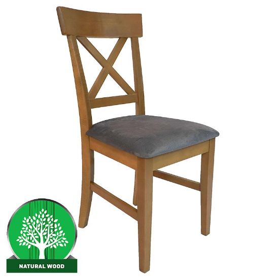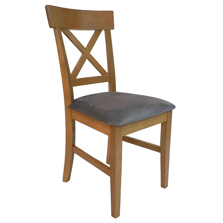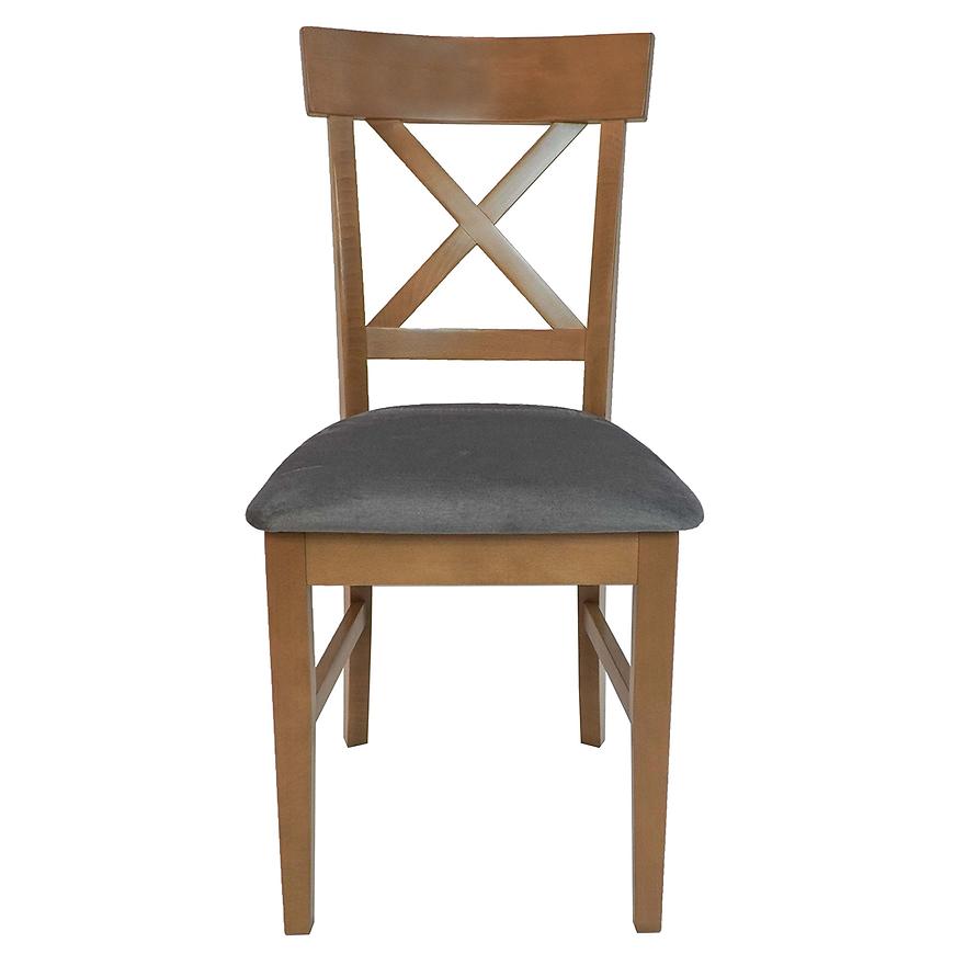 Siedzisko wykonane jest z tkaniny w szarym kolorze, która doskonale komponuje się z drewnopodobnym wybarwieniem. Tapicerka zapewnia wysoki komfort użytkowania, a wypełnienie pianką gwarantuje miękkość i odpowiednie wsparcie dla ciała.