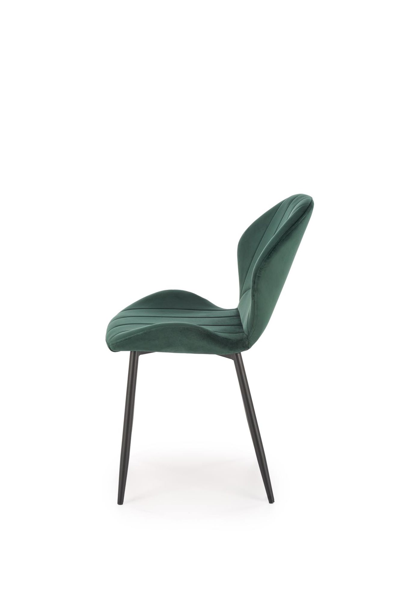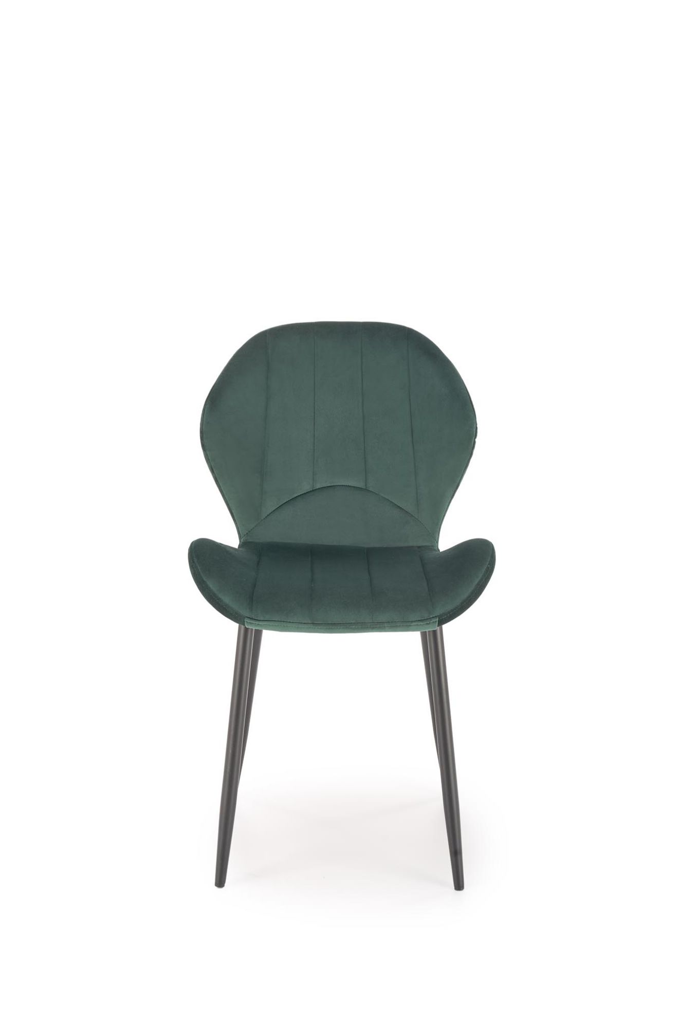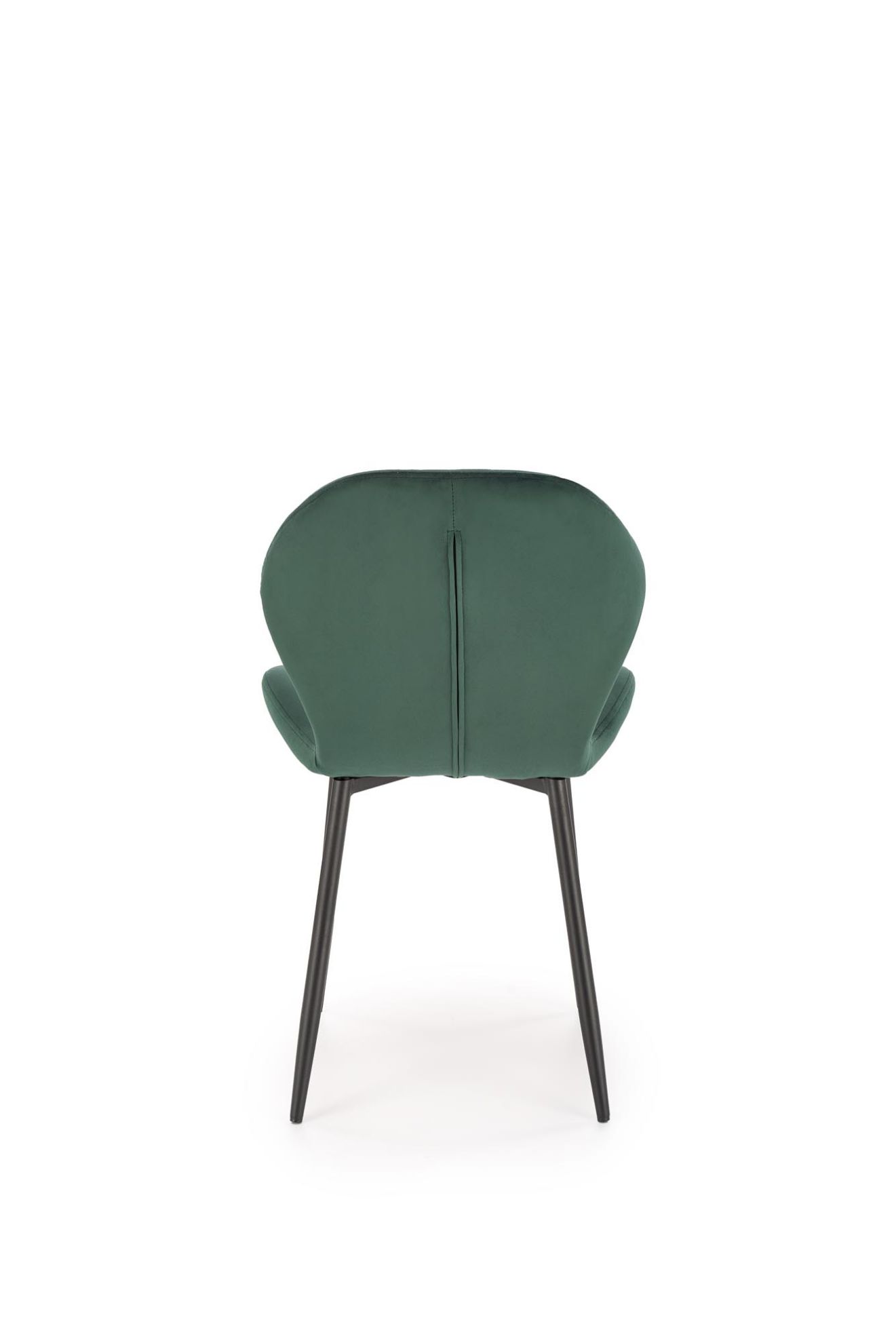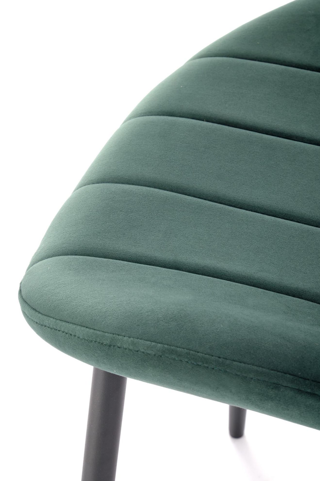 Siedzisko i oparcie pokryte są miękką, przyjemną w dotyku tkaniną velvet BLUVEL#78 w subtelnym, ciemnozielonym kolorze, który dodaje wnętrzu ciepła i elegancji. Stalowe nogi malowane proszkowo zapewniają stabilność i trwałość, a jednocześnie dzięki matowemu wykończeniu idealnie komponują się z welurową tkaniną.