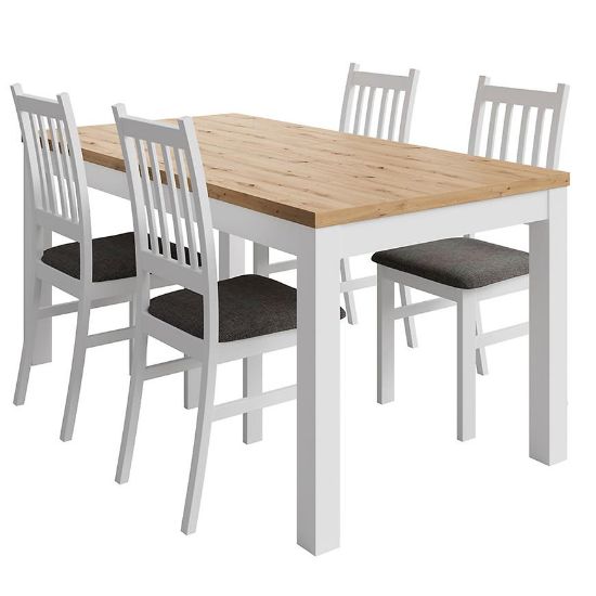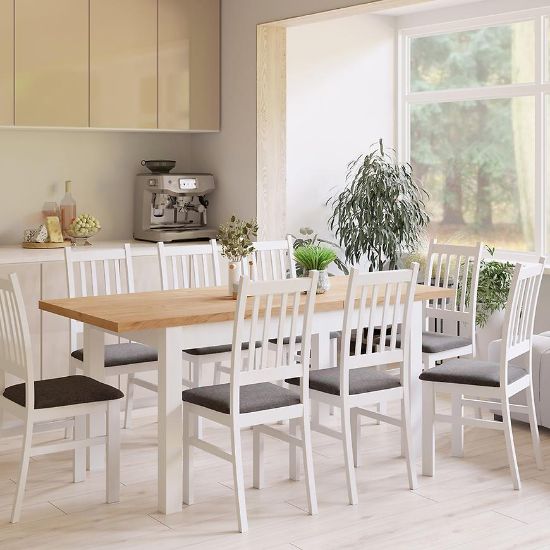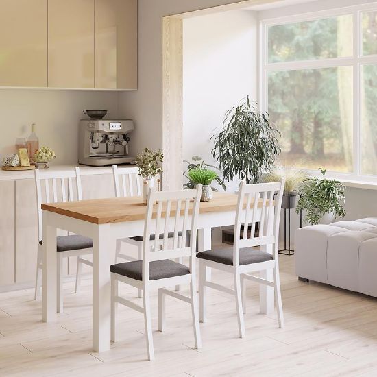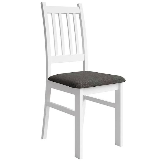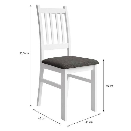 Stelaż krzesła wykonany jest z trwałego drewna w eleganckim, białym wybarwieniu, które nadaje mu lekkości i harmonijnie komponuje się z różnymi stylami wnętrzarskimi – od klasycznych po bardziej nowoczesne. Siedzisko krzesła, również wykonane z drewna, zostało pokryte tapicerką z szarej tkaniny, która nie tylko dodaje elegancji, ale także zapewnia komfort użytkowania. Wypełnienie siedziska stanowi miękka pianka, dzięki której długie godziny spędzone przy stole stają się przyjemniejsze.
