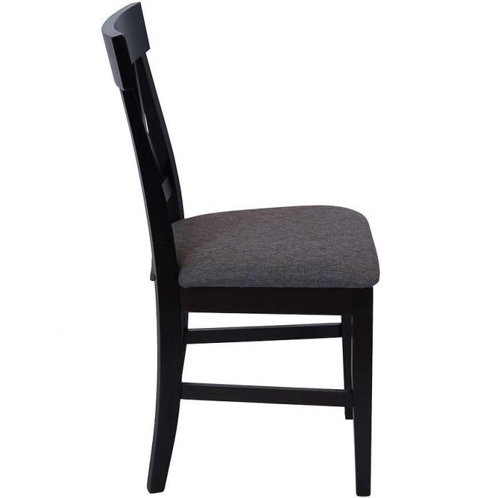Siedzisko krzesła zostało pokryte popielatą tkaniną, natomiast wypełnienie pianką zapewni komfort użytkowania. Całość została umieszczona na stabilnym, drewniamym stelażu w kolorze czarnym. Wysokość do siedziska wynosi 45 cm.