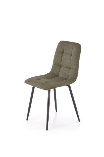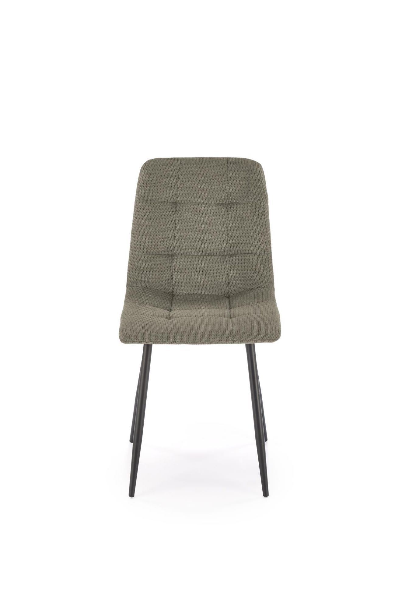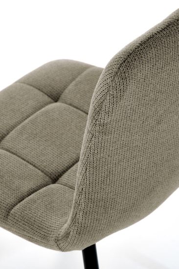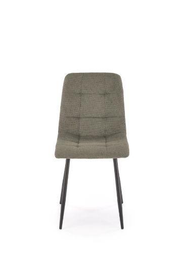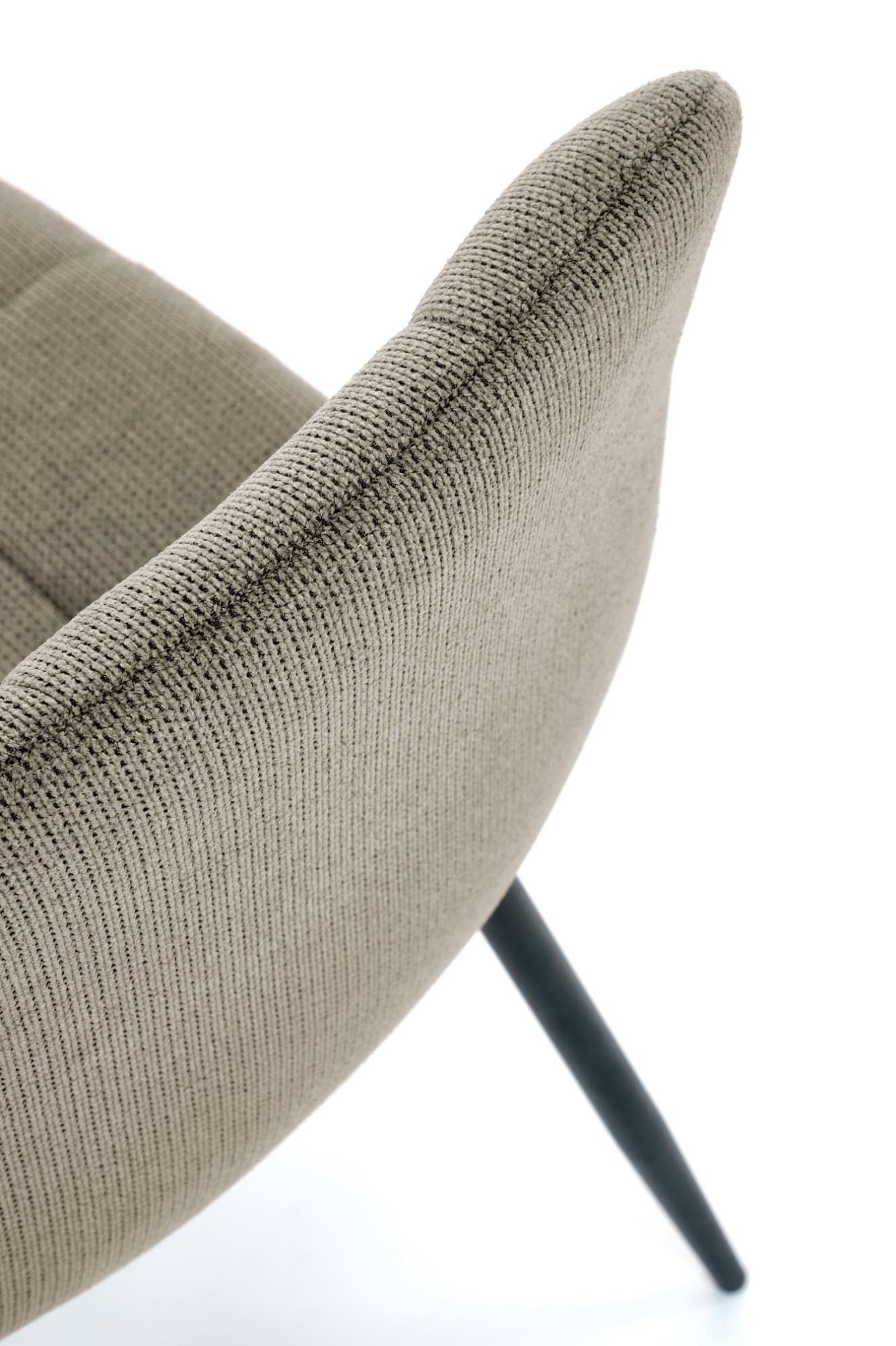Obite miękką tkaniną w stylowym oliwkowym kolorze, krzesło emanuje subtelną elegancją, która wprowadza do wnętrza ciepło i przytulność. Stalowe nogi malowane proszkowo zapewniają trwałość i stabilność, a ich nowoczesne wykończenie idealnie komponuje się z tkaniną, tworząc harmonijną całość.