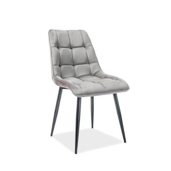 Krzesło Chic tapicerowane tkaniną Bluvel w kolorze szarym. Stelaż krzesła Chic wykonany z metalu w kolorze czarnym matowym. Dostępne w kolorach: szarym, różowym oraz zielonym.