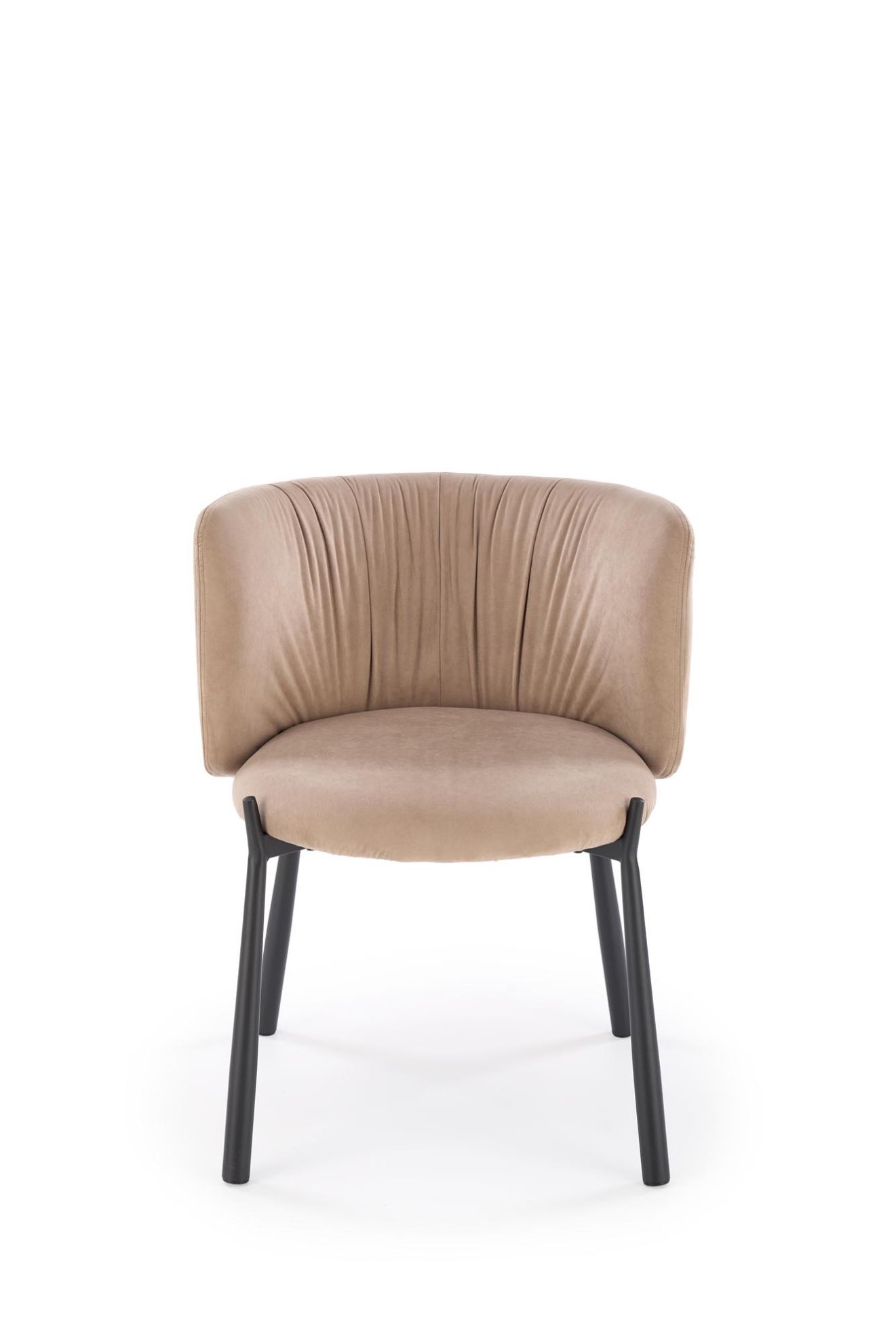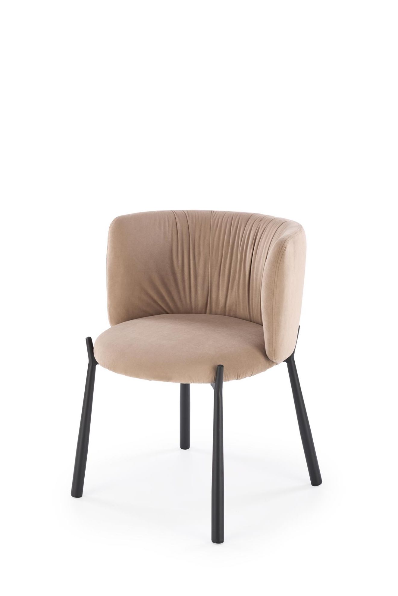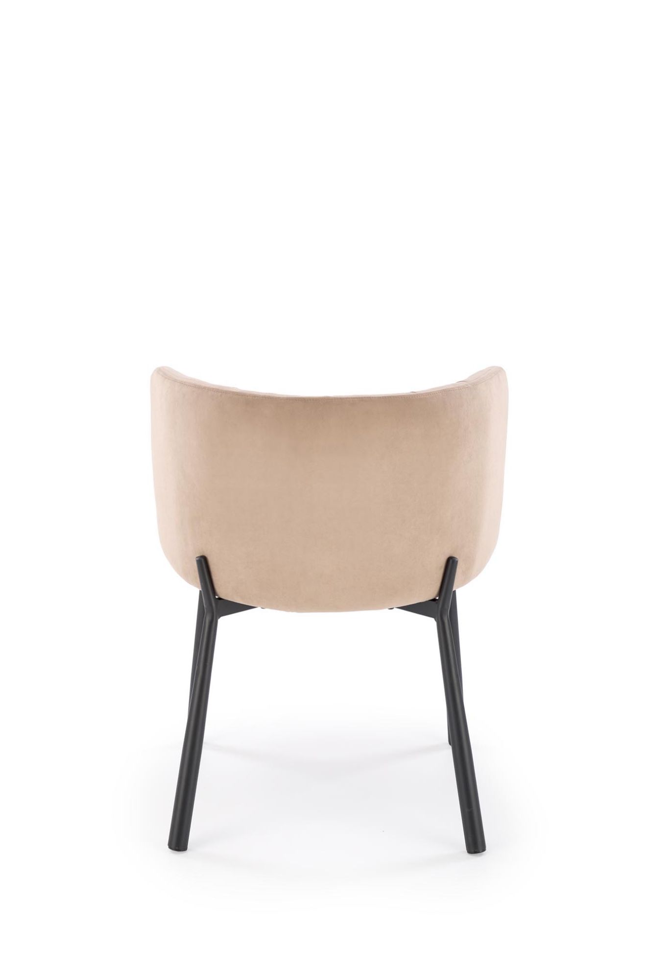 Siedzisko i oparcie krzesła są obite miękką i luksusową tkaniną velvet w eleganckim beżowym kolorze MAVEL#28, który dodaje wnętrzu ciepła i przytulności. Nogi krzesła wykonane są ze stali malowanej proszkowo, co gwarantuje trwałość i stabilność, a także nowoczesny wygląd.