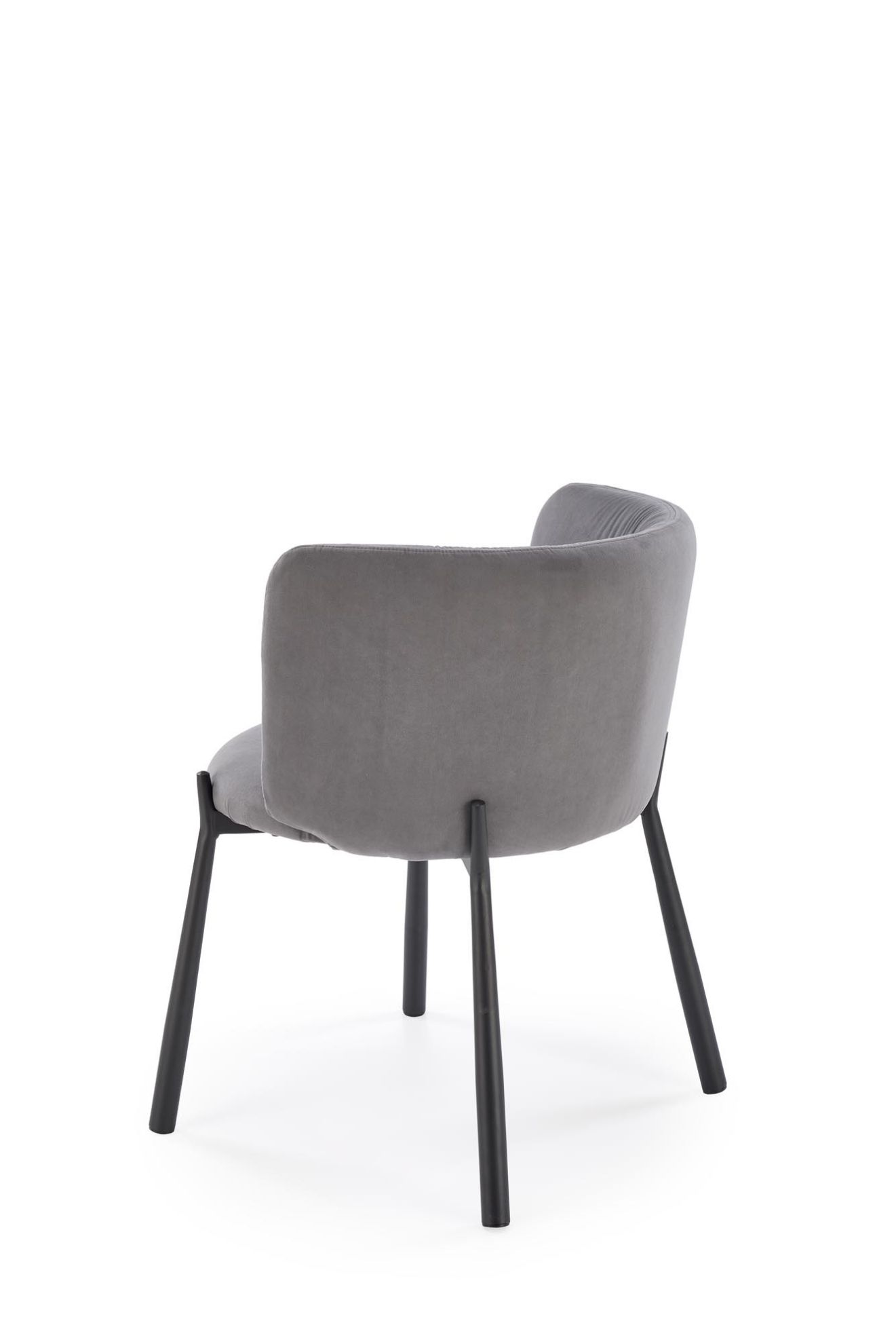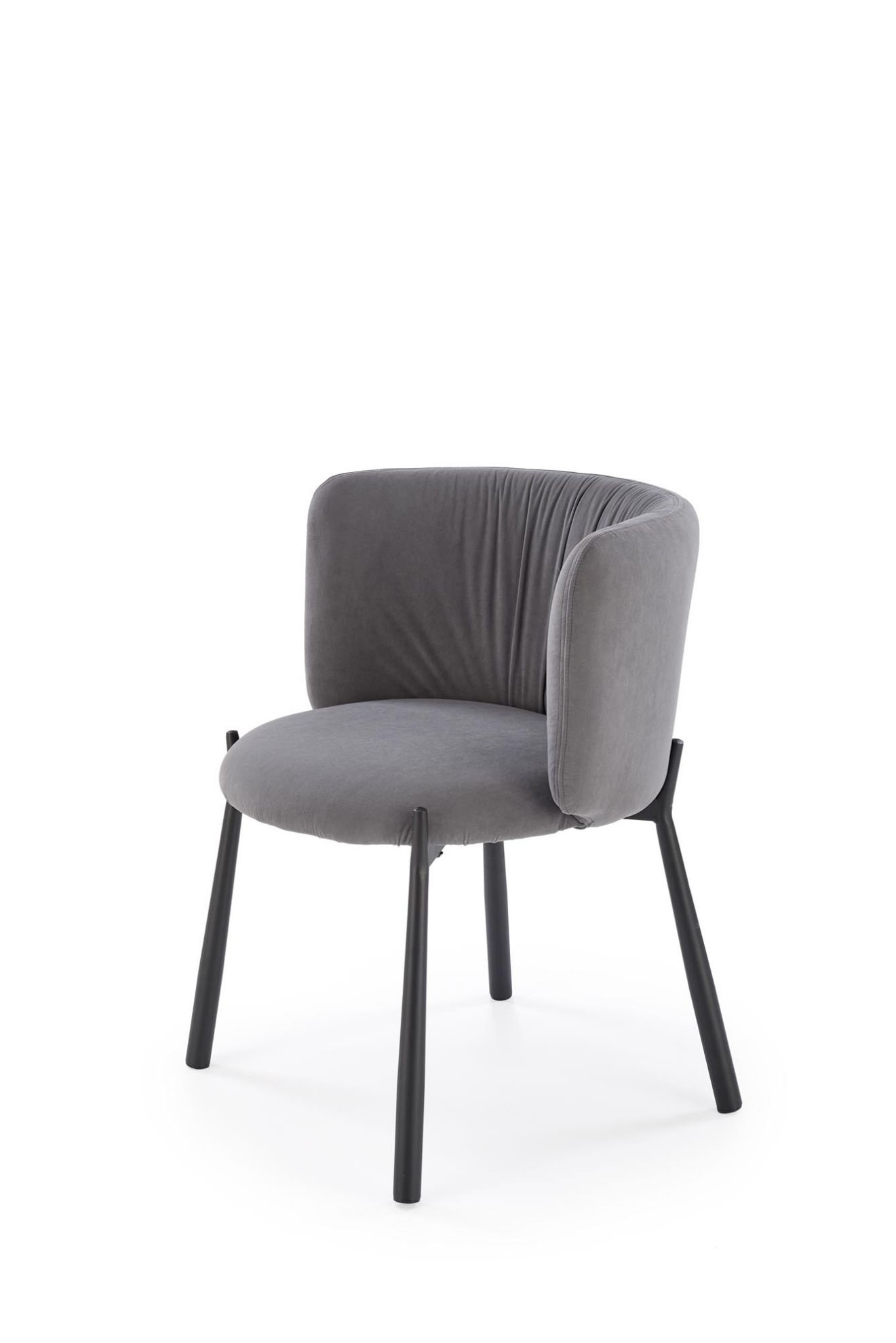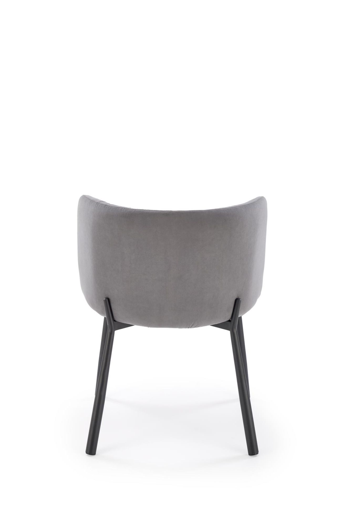 Siedzisko i oparcie krzesła są obite miękką i luksusową tkaniną velvet w eleganckim popielatym kolorze MAVEL#14, który dodaje wnętrzu ciepła i przytulności. Nogi krzesła wykonane są ze stali malowanej proszkowo, co gwarantuje trwałość i stabilność, a także nowoczesny wygląd.