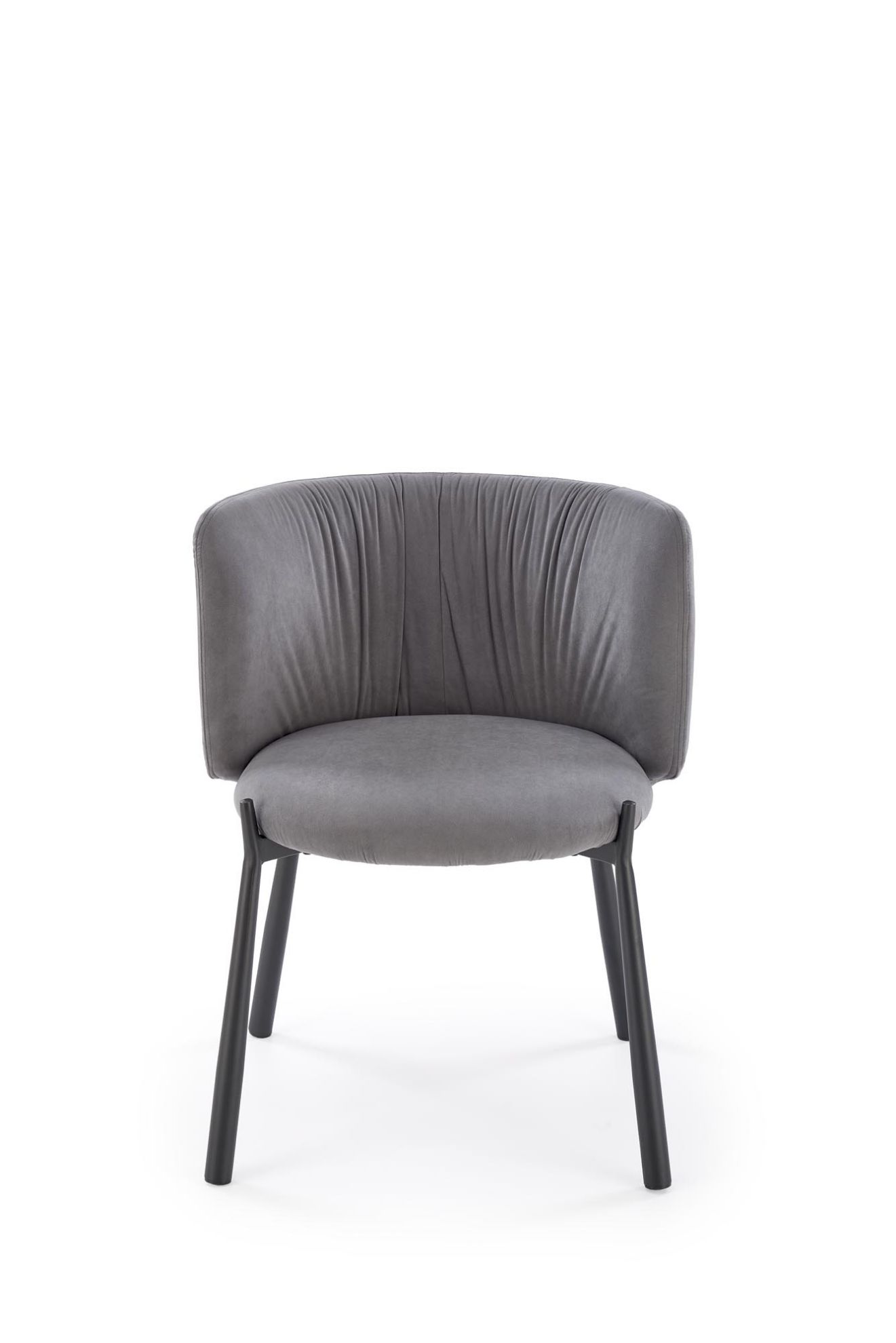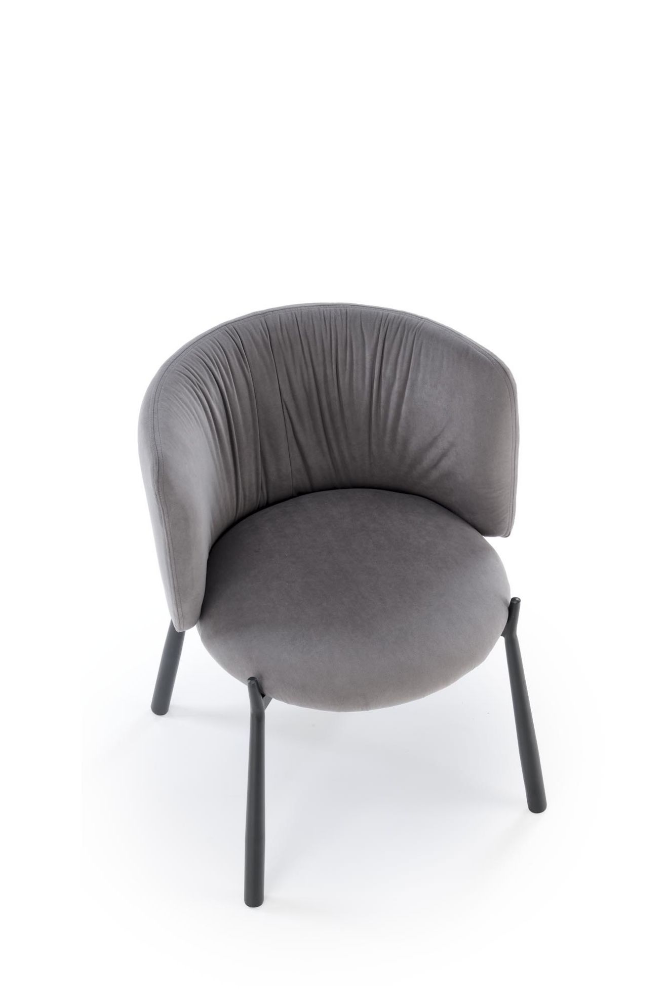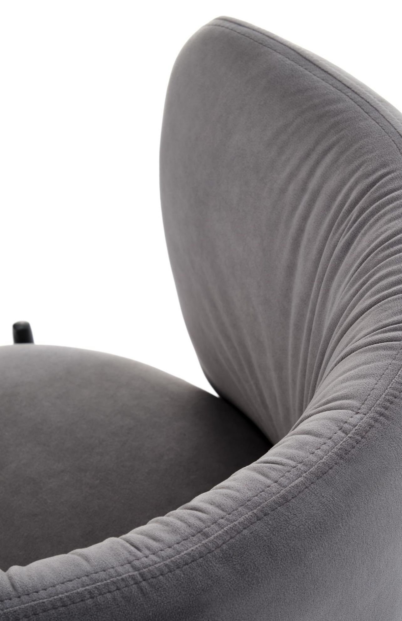 Siedzisko i oparcie krzesła są obite miękką i luksusową tkaniną velvet w eleganckim popielatym kolorze MAVEL#14, który dodaje wnętrzu ciepła i przytulności. Nogi krzesła wykonane są ze stali malowanej proszkowo, co gwarantuje trwałość i stabilność, a także nowoczesny wygląd.