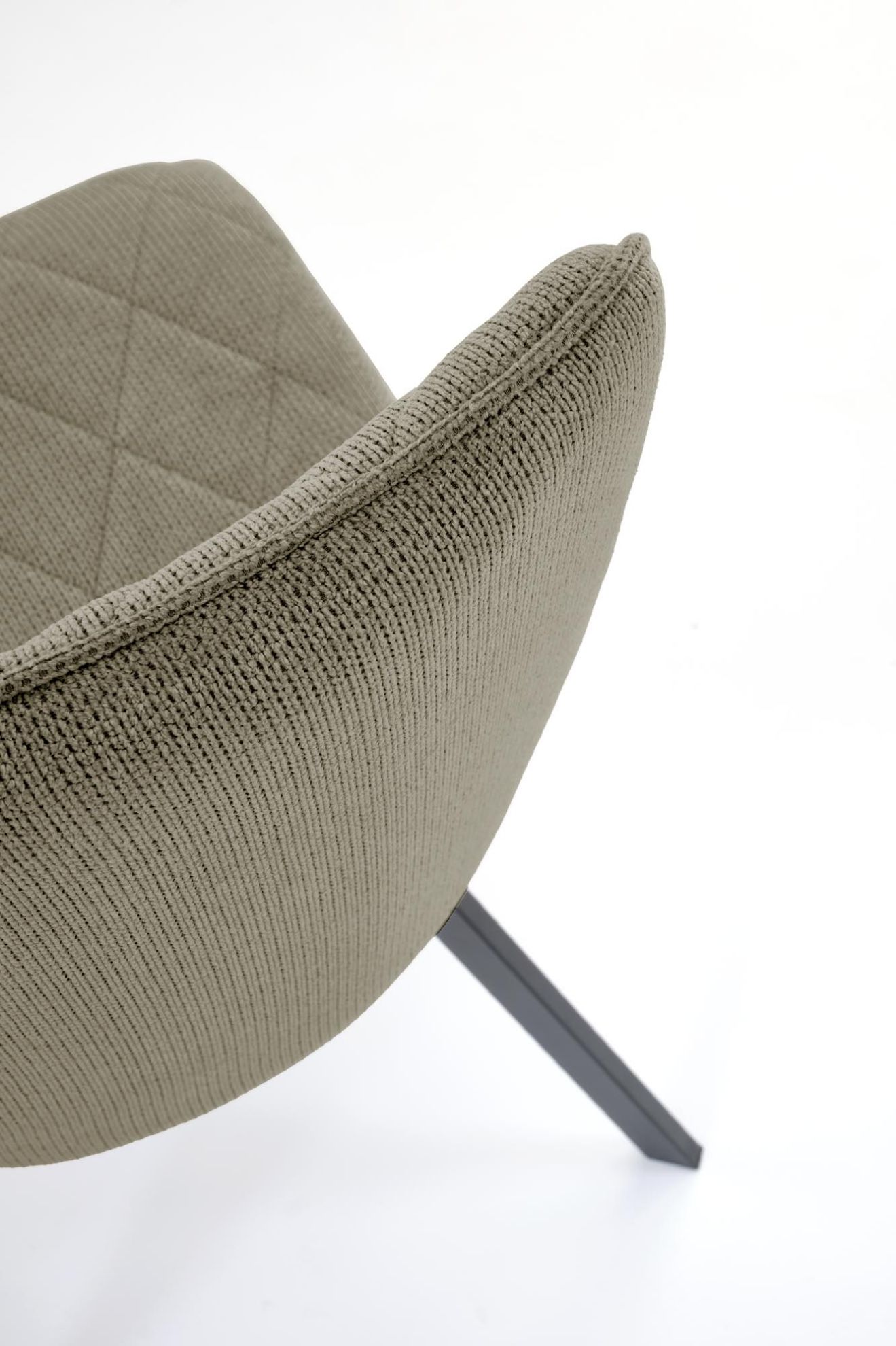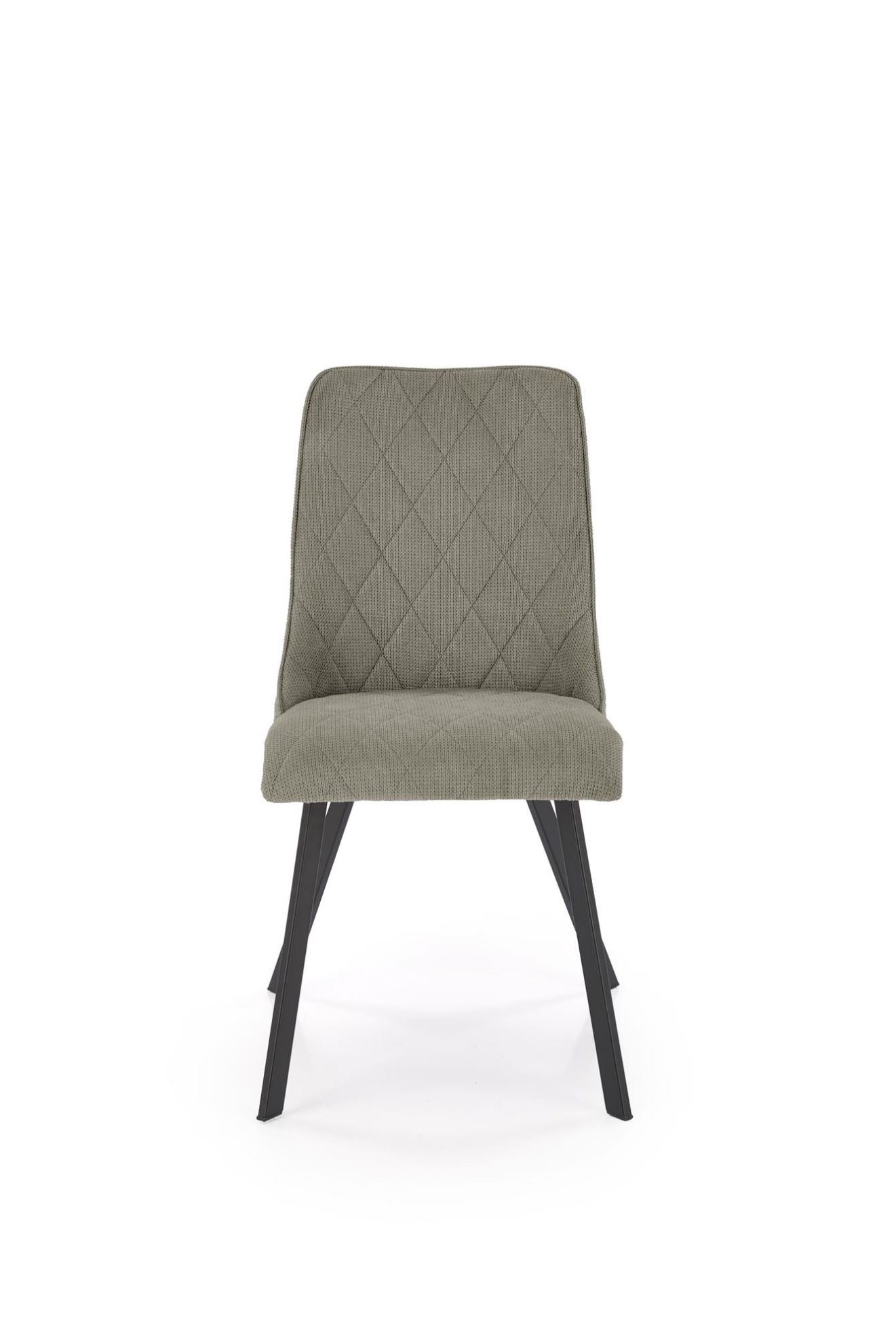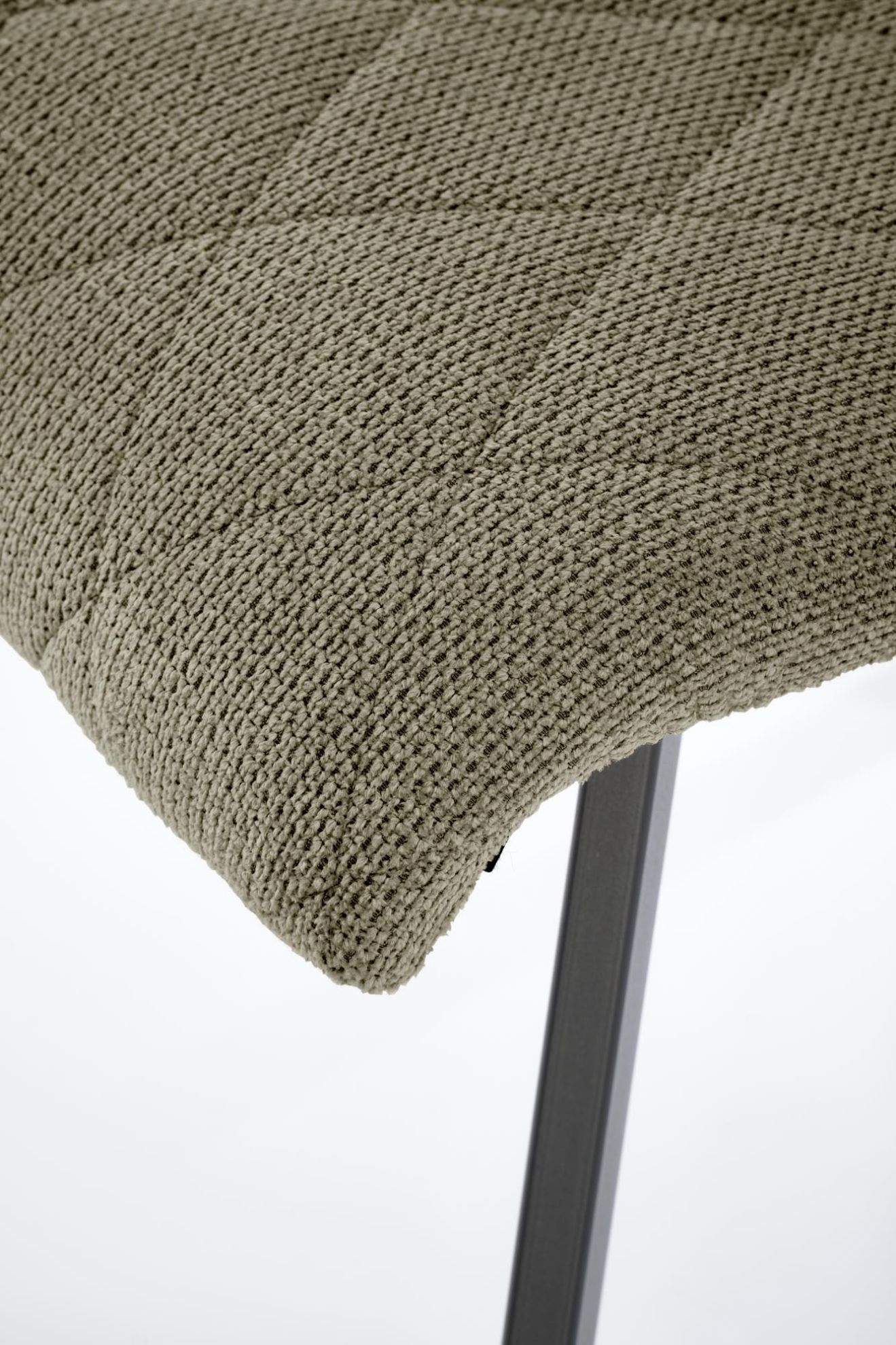 Siedzisko krzesła pokryte jest tkaniną VARDO#74 w eleganckim oliwkowym kolorze, która nadaje mu nowoczesnego wyglądu i wprowadza subtelny akcent do wnętrza. Stalowe nogi malowane proszkowo gwarantują stabilność i trwałość, a ich minimalistyczny design świetnie komponuje się z tapicerką.