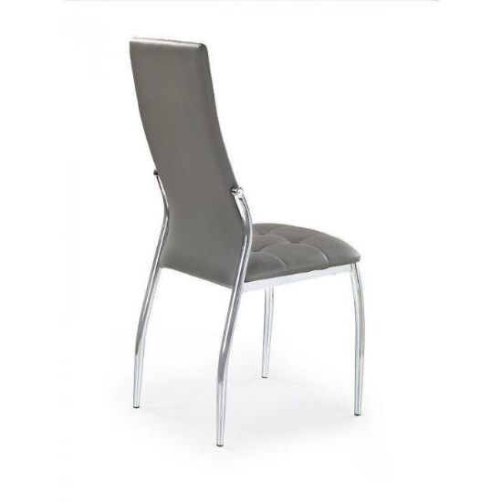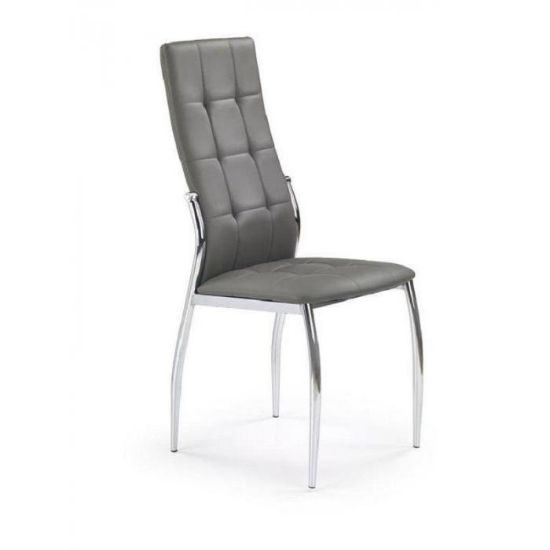 Siedzisko wykonano z ekoskóry, odpornej na ścieranie i łatwej w czyszczeniu. Stalowy chromowany stelaż zapewnia stabilność i trwałość krzesła, a minimalistyczna forma sprawia, że krzesło pasuje do nowoczesnych aranżacji kuchni i jadalni.
