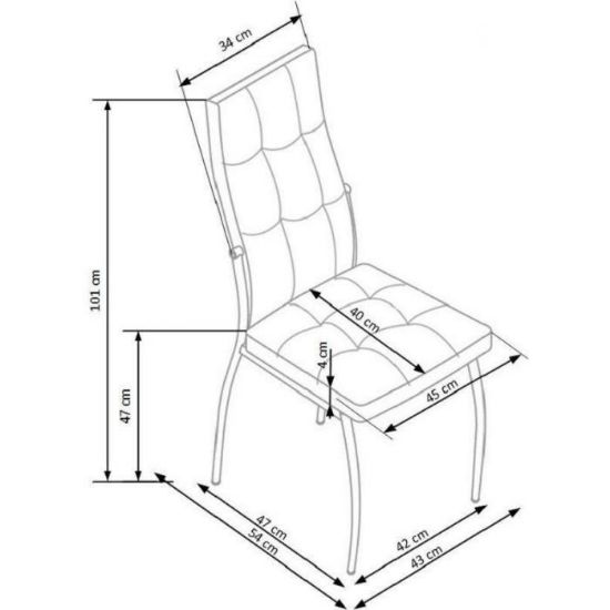Krzesło ma wysokość całkowitą 100 cm i wysokość do siedziska 47 cm, szerokość i głębokość siedziska wynoszą 42x42 cm, co zapewnia wygodę podczas codziennego użytkowania. Brak podłokietników zwiększa funkcjonalność i pozwala na wygodne ustawienie przy stole w jadalni lub kuchni.