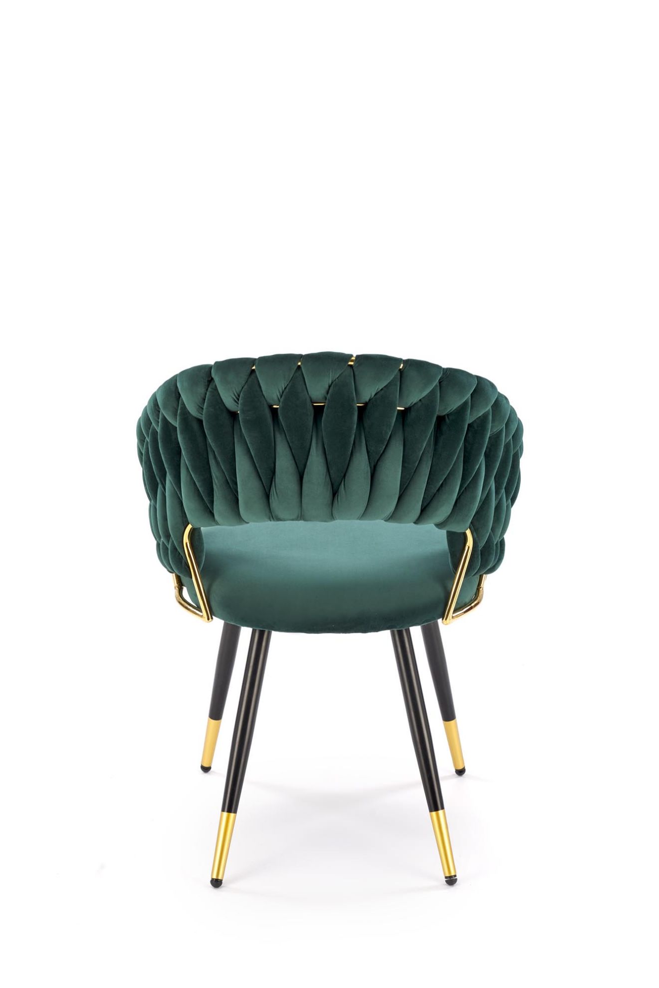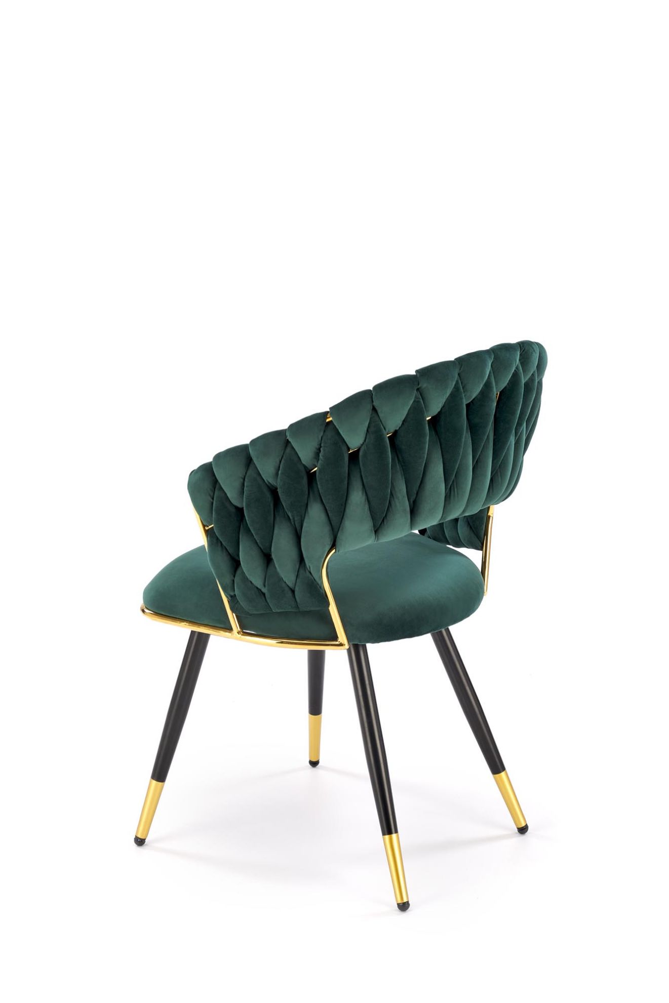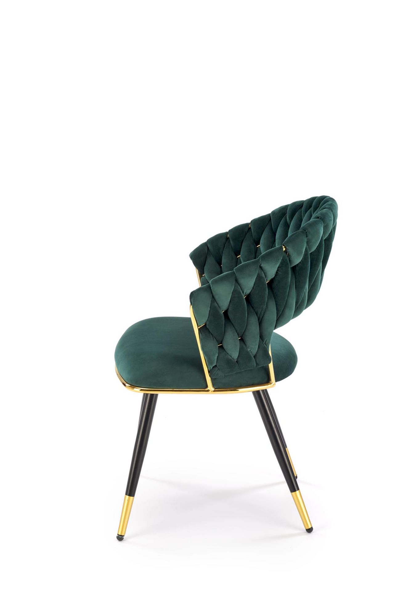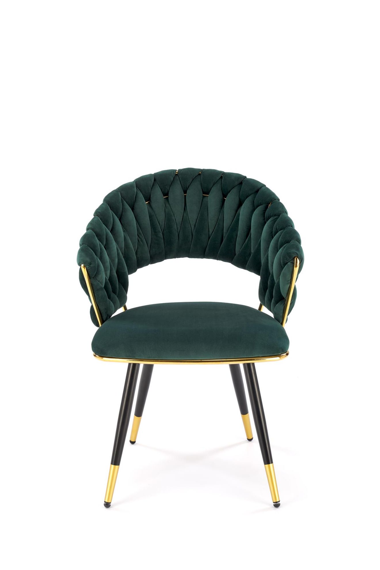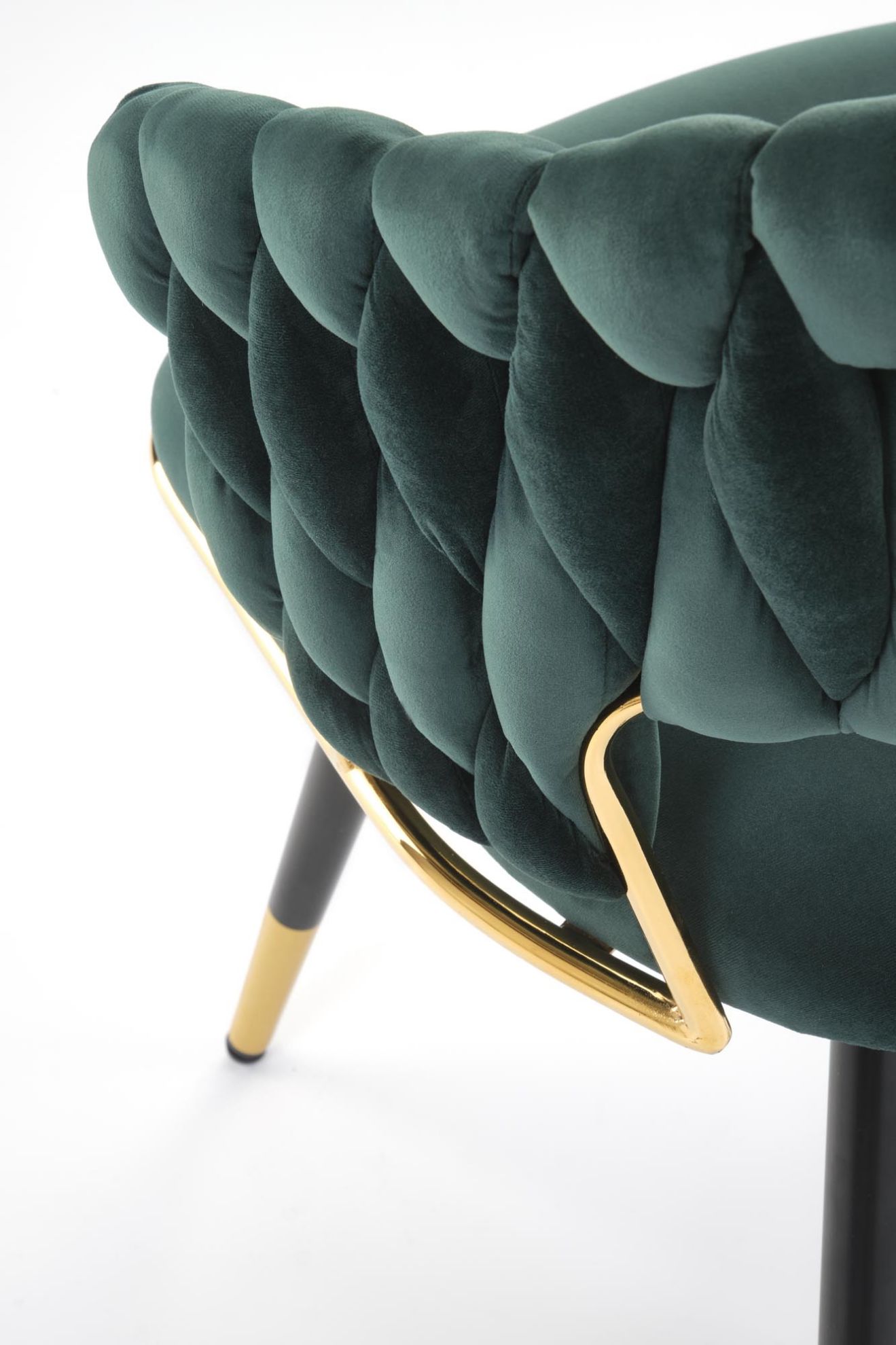 Siedzisko oraz oparcie obite są miękką tkaniną velvet BLUVEL#78 w głębokim, ciemnozielonym odcieniu, który dodaje wnętrzu szyku i przytulności. Stalowe nogi malowane proszkowo na złoty kolor oraz chromowane elementy nadają krzesłu elegancji i nowoczesnego charakteru, tworząc harmonijne połączenie z welurową tkaniną.