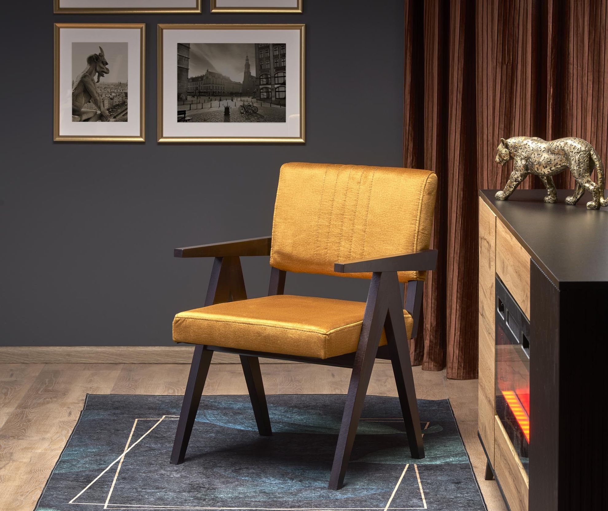 Stelaż krzesła w kolorze hebanu tworzy kontrast z tkaniną, dodając mu wyjątkowego charakteru. Konstrukcja ta nie tylko gwarantuje stabilność, ale także nadaje krzesłu elegancki wygląd.