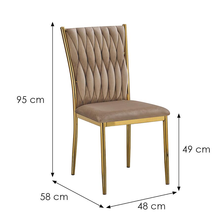 Krzesło Glamour 12512 beżowe/złote to stylowe połączenie nowoczesnej elegancji i komfortu. Wykonane z solidnego metalu oraz miękkiej tkaniny tapicerskiej, prezentuje się wyjątkowo szykownie. Beżowe siedzisko z wypełnieniem z pianki gwarantuje wygodę, a złoty stelaż nadaje całości luksusowego charakteru. Krzesło ma wysokość 95 cm, wysokość do siedziska 49 cm, szerokość 48 cm i głębokość 58 cm, przy wadze 7 kg. To elegancki, trwały i funkcjonalny mebel, który łączy estetykę, wygodę i jakość wykonania, wymagający samodzielnego złożenia.