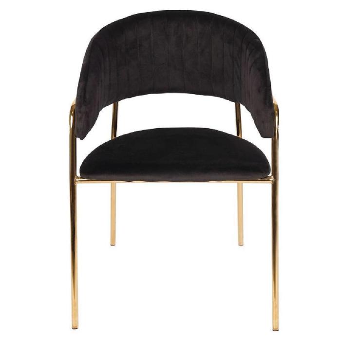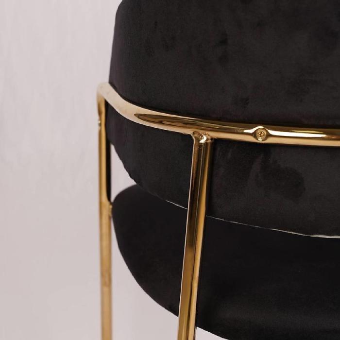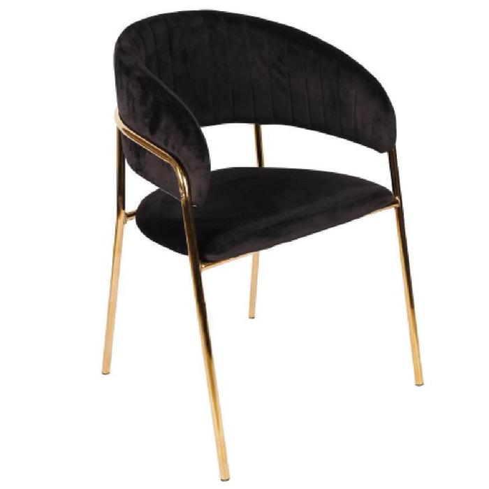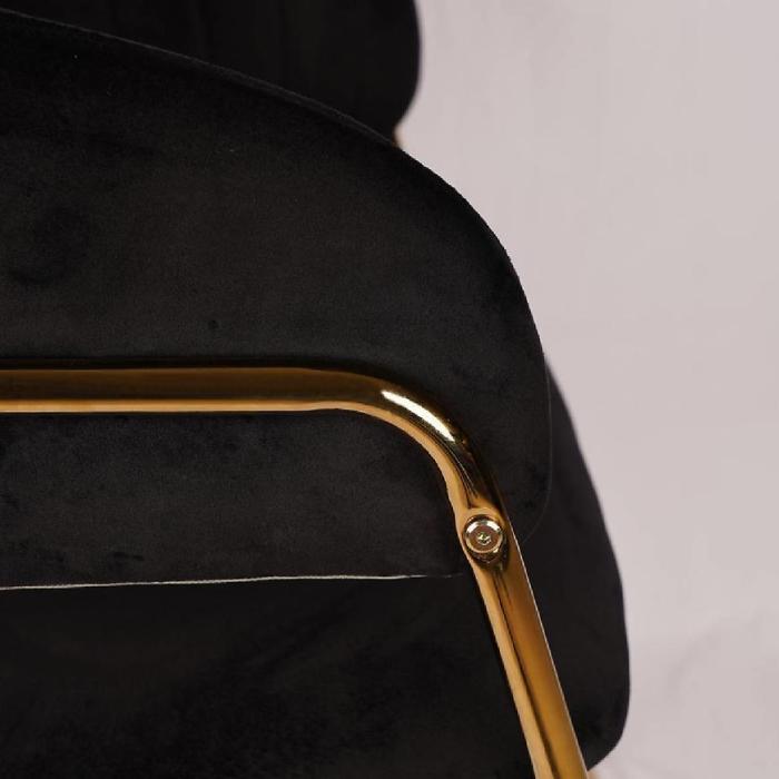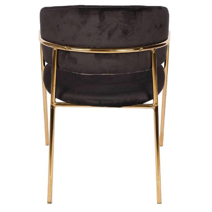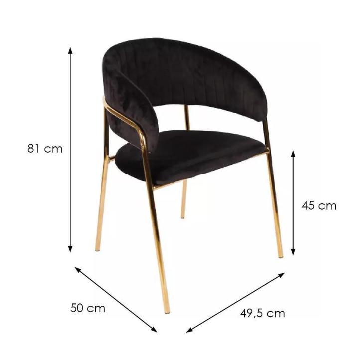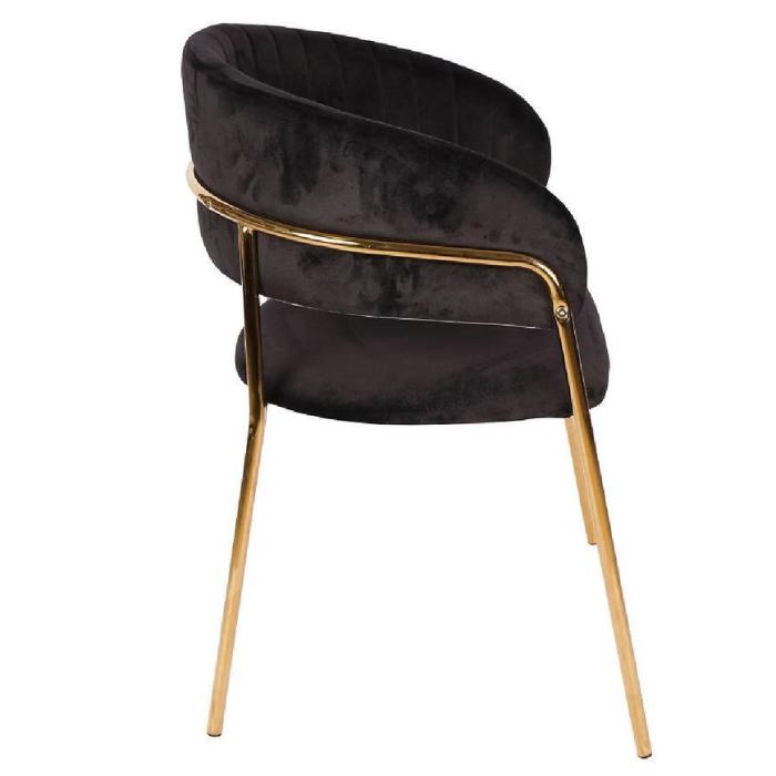 Złoty stelaż krzesła wykonany z metalu nadaje unikatowego wyglądu. Siedzisko zrobione z tkaniny wypełnionej pianką, co dodatkowo zwiększa komfort użytkowania.