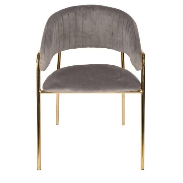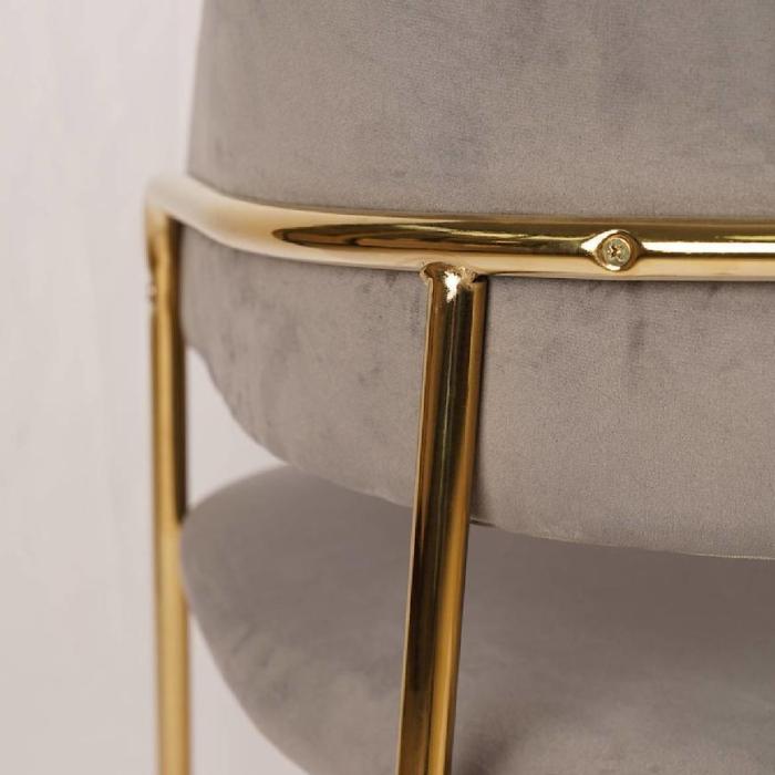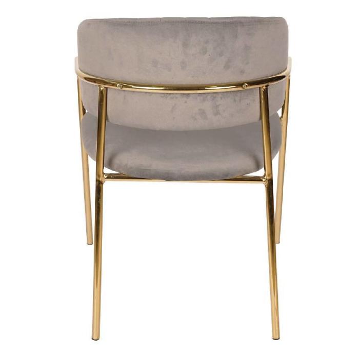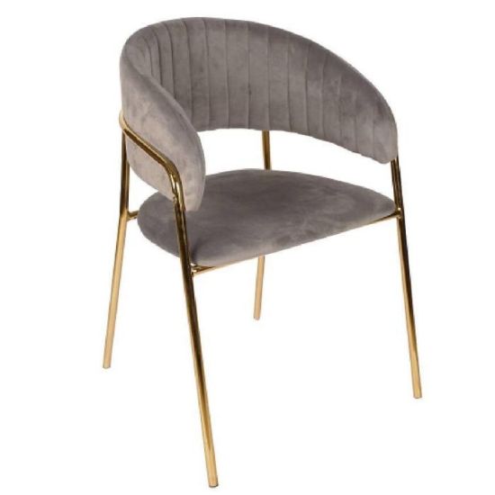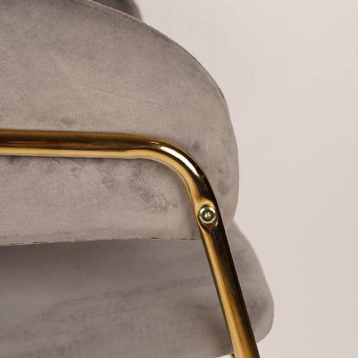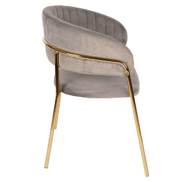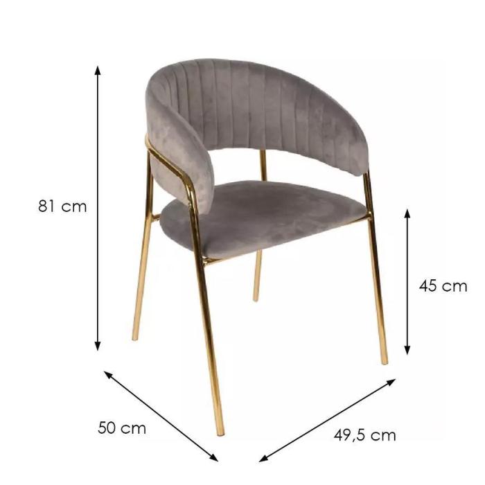 Złoty stelaż krzesła wykonany z metalu nadaje unikatowego wyglądu. Siedzisko zrobione z tkaniny wypełnionej pianką, co dodatkowo zwiększa komfort użytkowania.