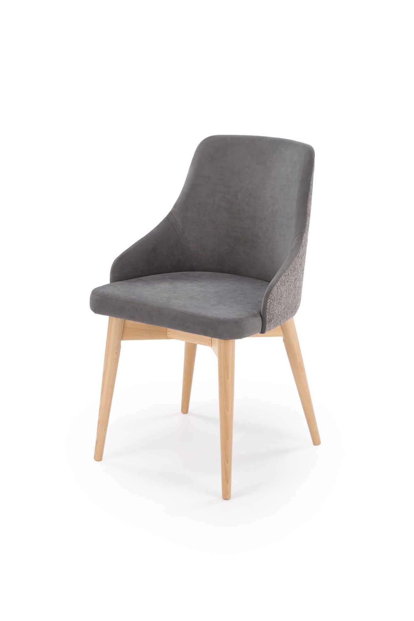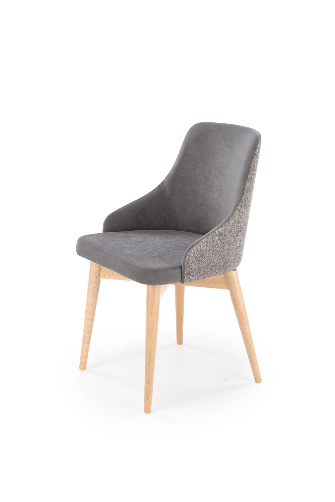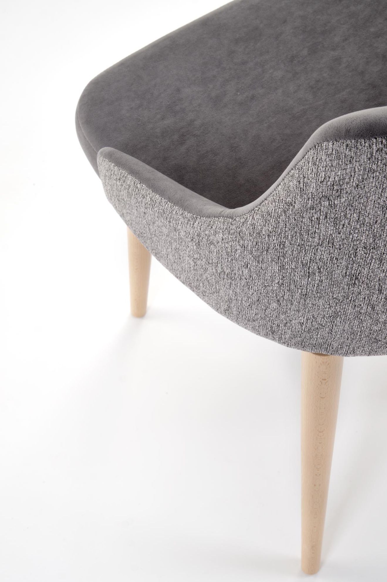 Krzesło jest wykonane z wysokiej jakości materiałów: siedzisko i oparcie pokryte są wytrzymałą tkaniną (MAVEL 14/STELAR 92) w kolorze popielatym, co zapewnia komfort użytkowania. Nogi krzesła są wykonane ze drewna litego bukowego, co dodaje nowoczesnego wyglądu i zapewnia solidność konstrukcji.