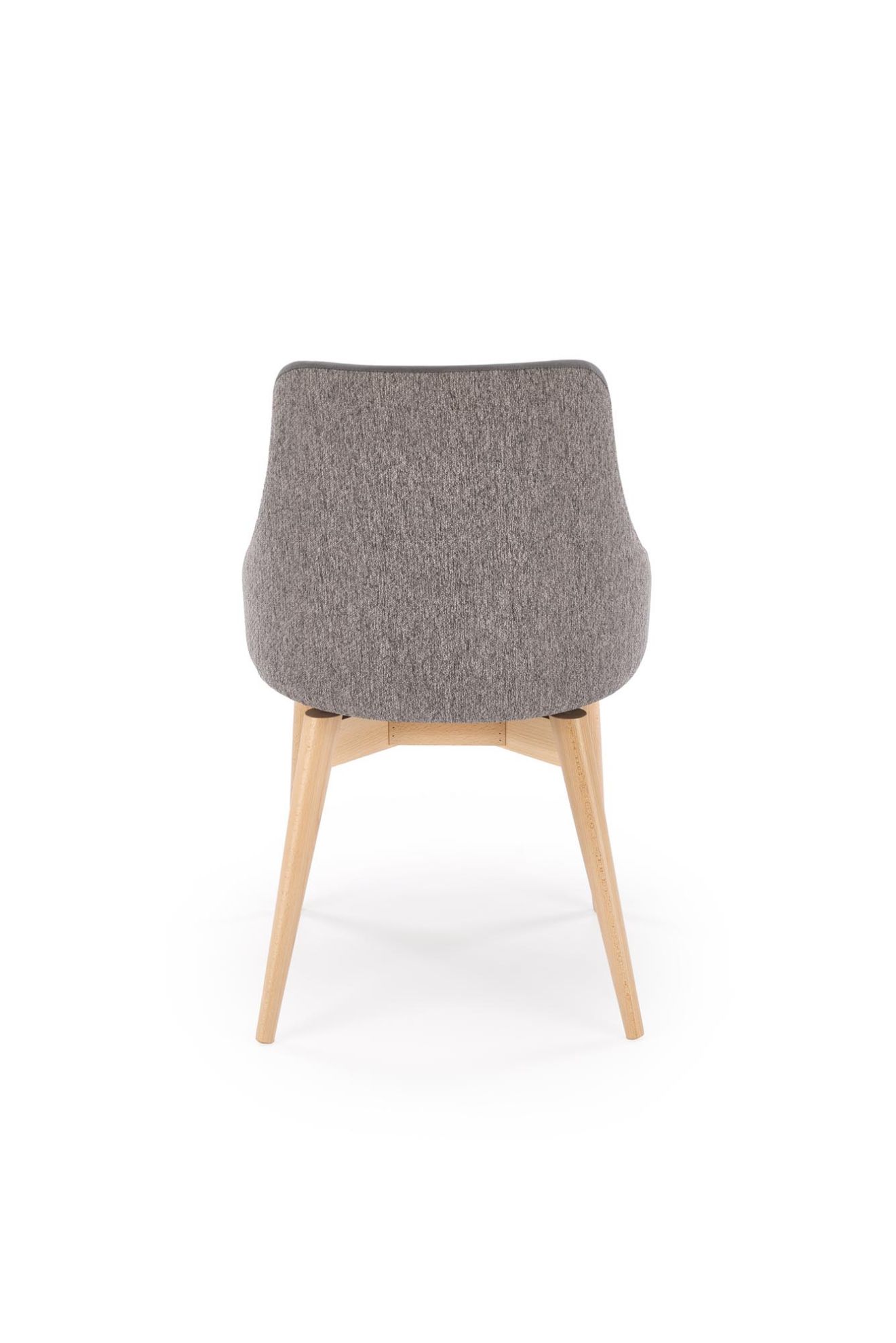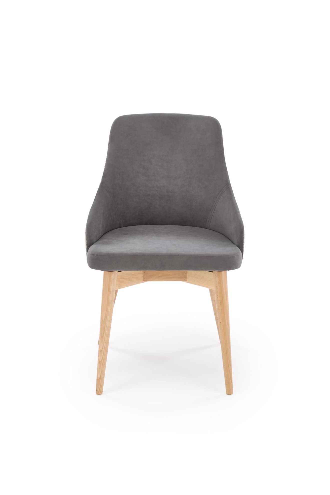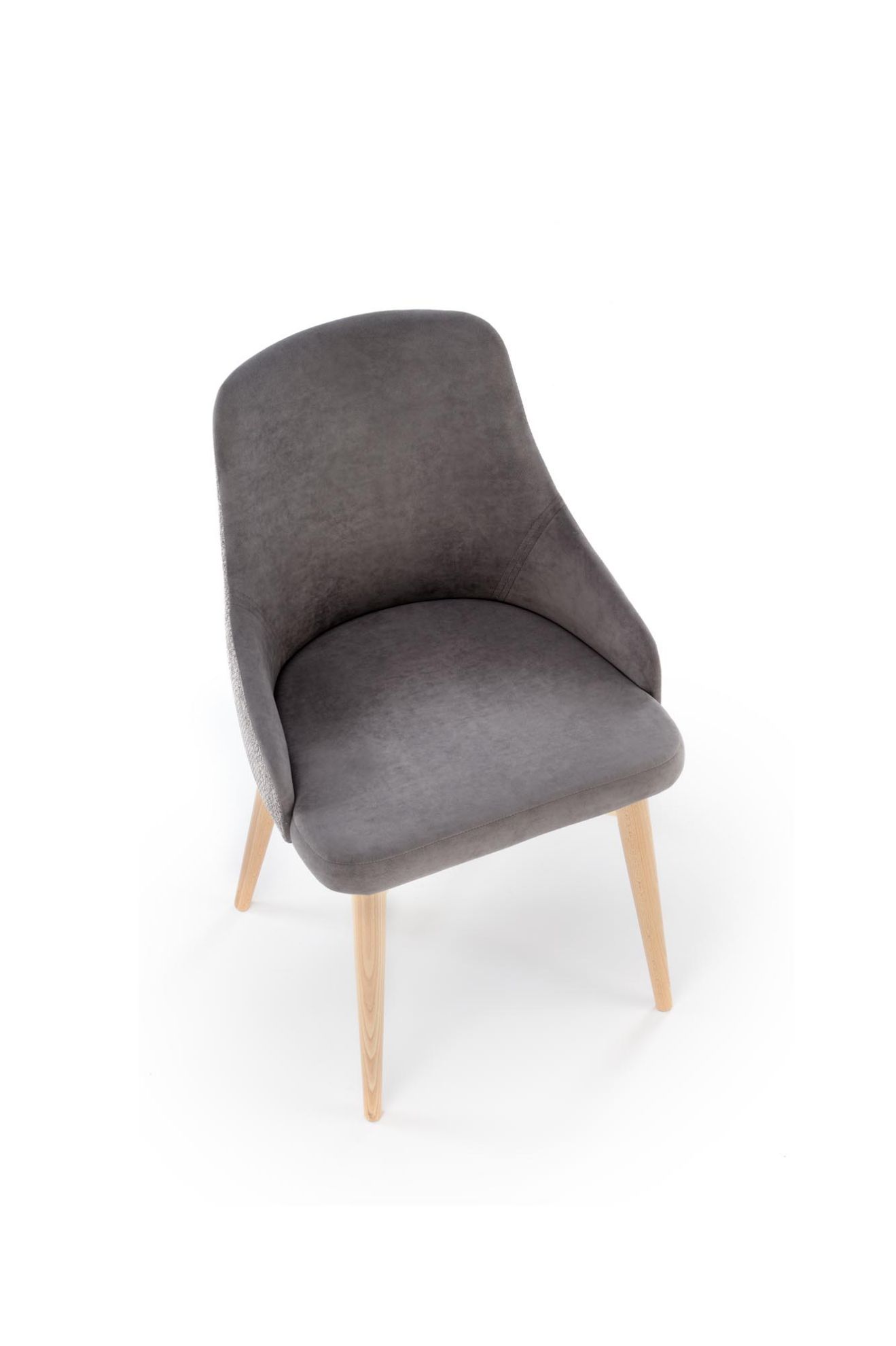 Krzesło jest wykonane z wysokiej jakości materiałów: siedzisko i oparcie pokryte są wytrzymałą tkaniną (MAVEL 14/STELAR 92) w kolorze popielatym, co zapewnia komfort użytkowania. Nogi krzesła są wykonane ze drewna litego bukowego, co dodaje nowoczesnego wyglądu i zapewnia solidność konstrukcji.