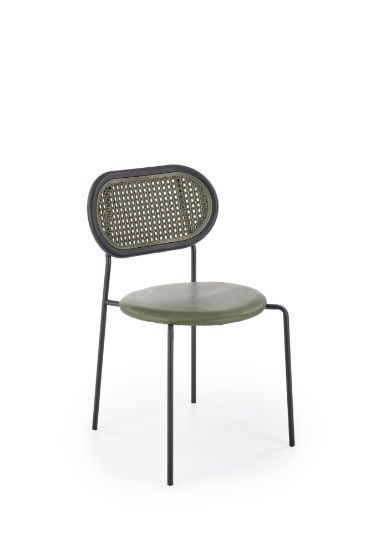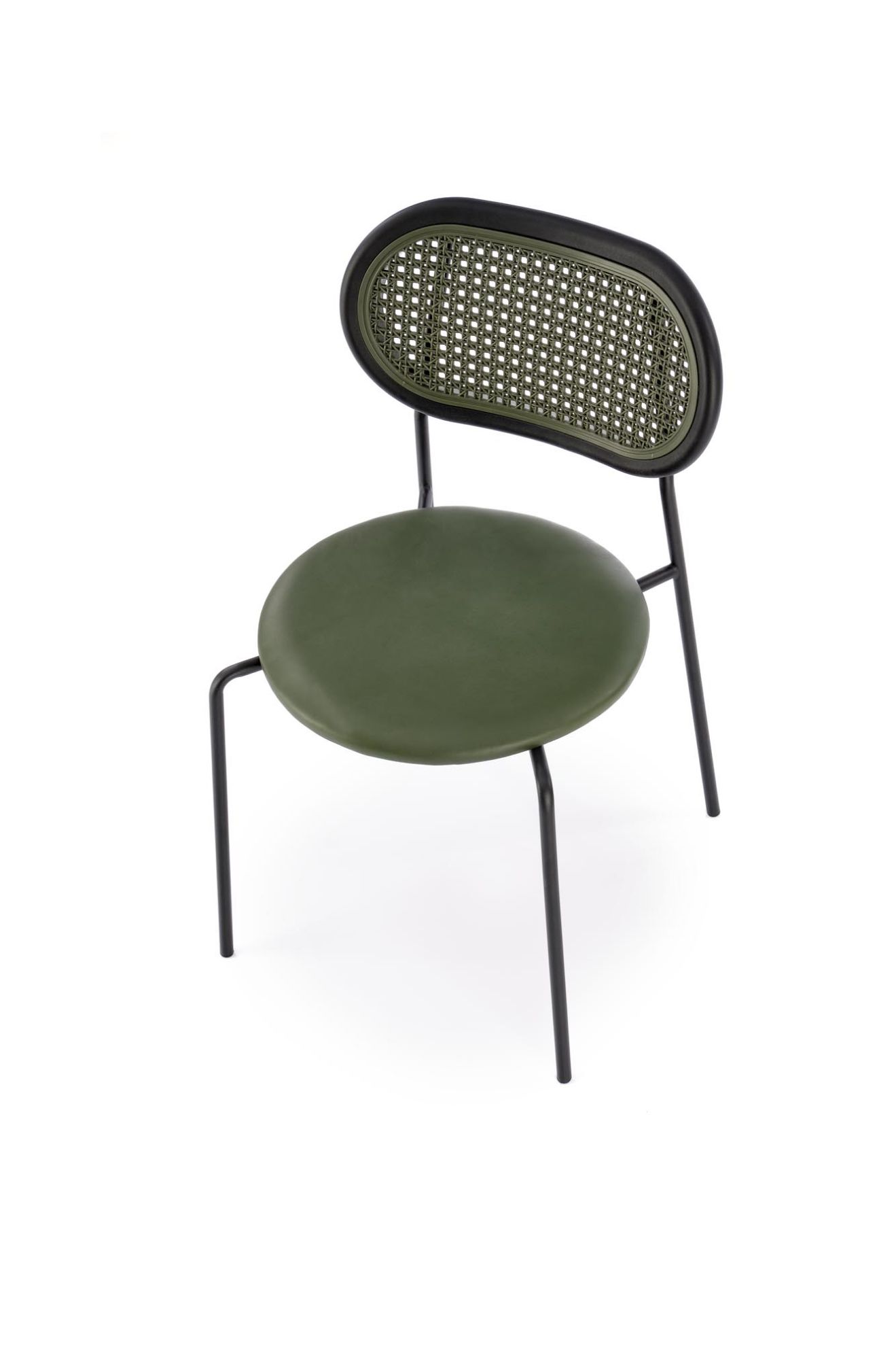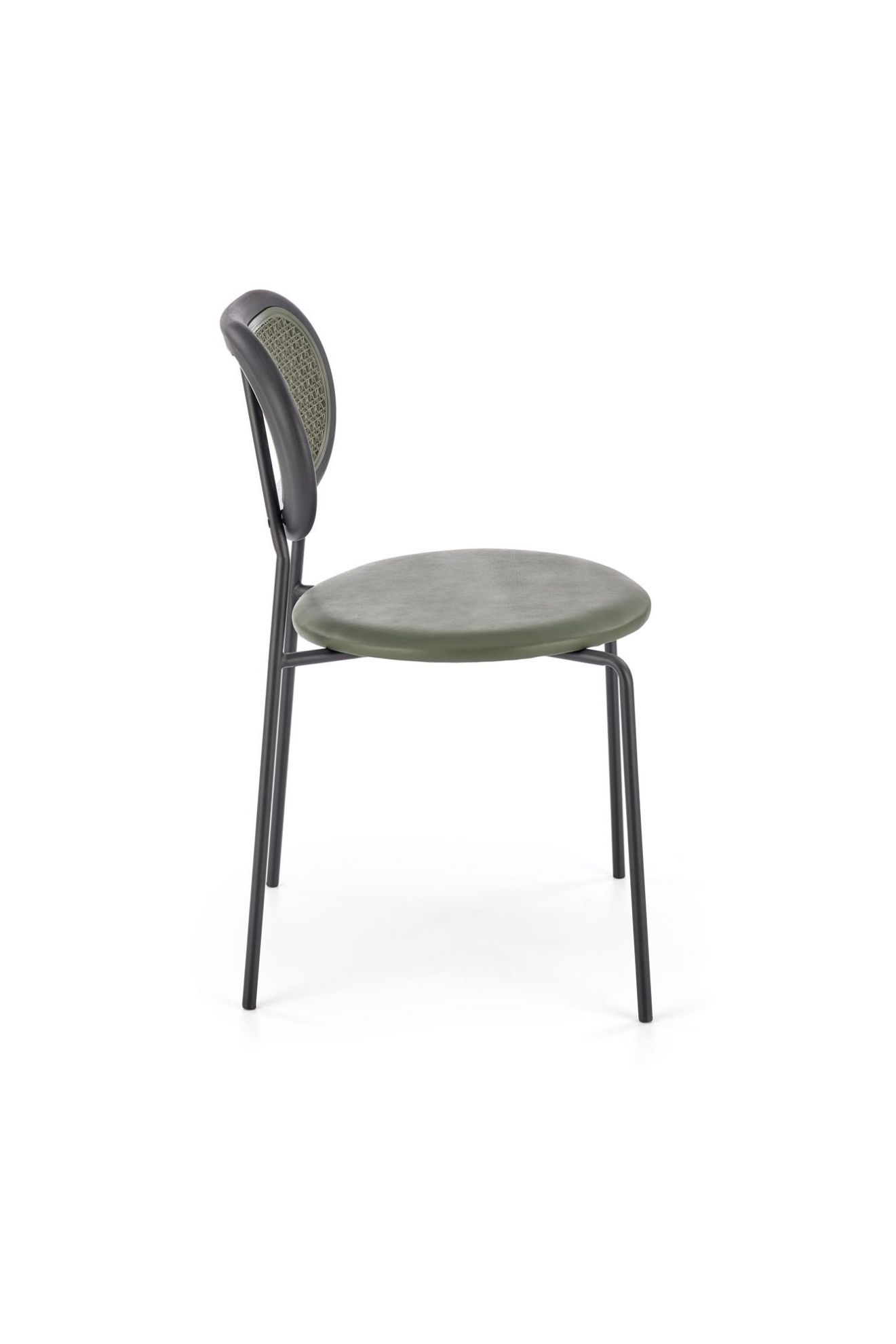 Siedzisko krzesła zostało obite ekoskórą, co nadaje mu elegancki wygląd i zapewnia wygodę podczas siedzenia. Ekoskóra jest trwała i łatwa w utrzymaniu, co sprawia, że krzesło jest praktycznym wyborem. Elementy dekoracyjne z rattanu syntetycznego i polipropylenu dodają krzesłu naturalnego uroku i ciepła. Rattan syntetyczny jest trwały i odporny na warunki atmosferyczne, dzięki czemu to krzesło może być używane zarówno wewnątrz, jak i na zewnątrz pomieszczenia. Konstrukcja krzesła została dodatkowo wzmocniona stalową ramą malowaną proszkowo, co gwarantuje stabilność i wytrzymałość.