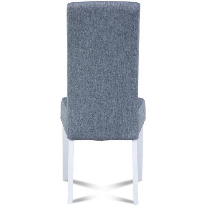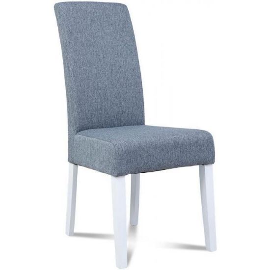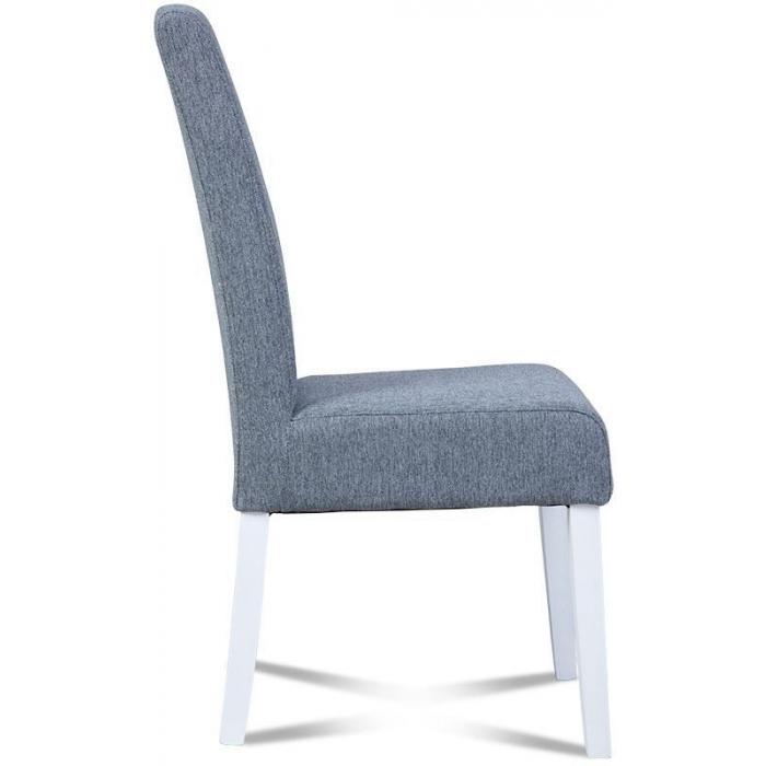 Krzesło tapicerowane Lugo. Siedzisko i oparcie tapicerowane tkaniną w kolorze popielatym. Stelaż z drewna bukowego barwiony na kolor biały.