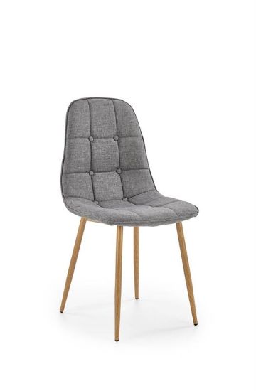 Krzesło wykonane jest z wysokiej jakości materiałów. Tapicerka z miękkiej, popielatej tkaniny dodaje mu elegancji i przytulności, idealnie komponując się z różnorodnymi aranżacjami wnętrz. Nogi krzesła wykonane są ze stali malowanej na kolor dębu miodowego, co zapewnia trwałość oraz stabilność, jednocześnie nadając meblowi ciepły, naturalny wygląd.