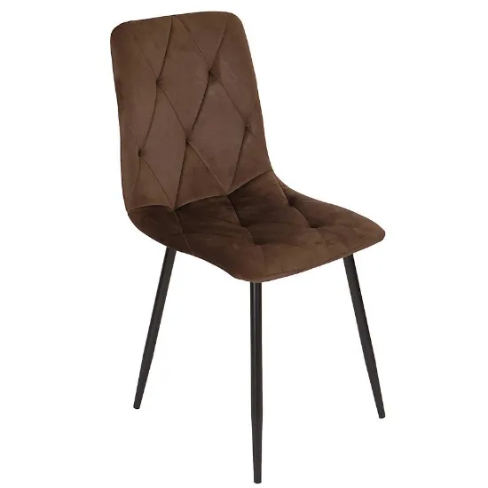 Siedzisko krzesła Naomi zostało wykonane z przyjemnej w dotyku tkaniny welurowej w kolorze brązowym, która dodaje wnętrzu ciepła i elegancji. Welur jest materiałem chętnie wybieranym do nowoczesnych aranżacji, ponieważ łączy atrakcyjny wygląd z komfortem użytkowania. Wypełnienie z pianki zapewnia odpowiednią sprężystość i wygodę, nawet przy intensywnym użytkowaniu. Stabilny metalowy stelaż w kolorze czarnym podkreśla loftowy charakter krzesła, a jednocześnie gwarantuje trwałość i odporność na codzienne obciążenia. Metalowa rama sprawia, że krzesło Naomi waży jedynie 4 kg, dzięki czemu jest łatwe do przenoszenia i ustawiania.