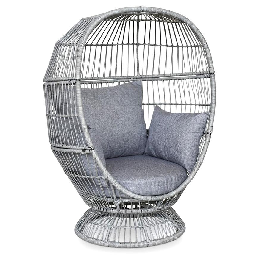 Krzesło Cuddie zostało zaprojektowane z myślą o maksymalnym komforcie – obrotowa konstrukcja pozwala na płynny obrót o 360°, a komplet miękkich poduszek na siedzisku i oparciu zapewnia wygodę podczas długiego siedzenia. Poduszki są wykonane z materiałów łatwych w utrzymaniu czystości, co ułatwia codzienne użytkowanie. Wymiary fotela – 147 cm wysokości, 97 cm szerokości i 113 cm głębokości – sprawiają, że doskonale sprawdzi się zarówno w większych, jak i mniejszych przestrzeniach ogrodowych.