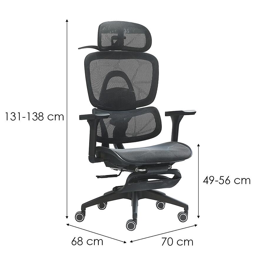 Model Noxar oferuje szerokie możliwości dopasowania do indywidualnych potrzeb. Regulowana wysokość siedziska (od 49 do 56 cm) oraz wysokość całkowita (131–138 cm) pozwalają ustawić krzesło zgodnie z ergonomią pracy. Regulowane oparcie wspiera plecy na całej długości, a zagłówek umożliwia wygodne podparcie karku podczas przerw lub pracy w pozycji odchylonej.