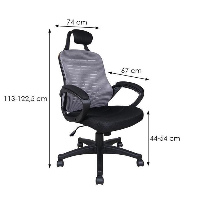 Krzesło ma wymiary 74 cm szerokości i 67 cm głębokości, co pozwala na komfortowe użytkowanie w biurach i domowych gabinetach. Wysokość siedziska regulowana jest w zakresie 44–54 cm, a całkowita wysokość fotela wynosi 113–122,5 cm, co umożliwia dopasowanie krzesła do wzrostu użytkownika i wysokości biurka. Maksymalne obciążenie wynosi 120 kg, zapewniając stabilność i bezpieczeństwo.