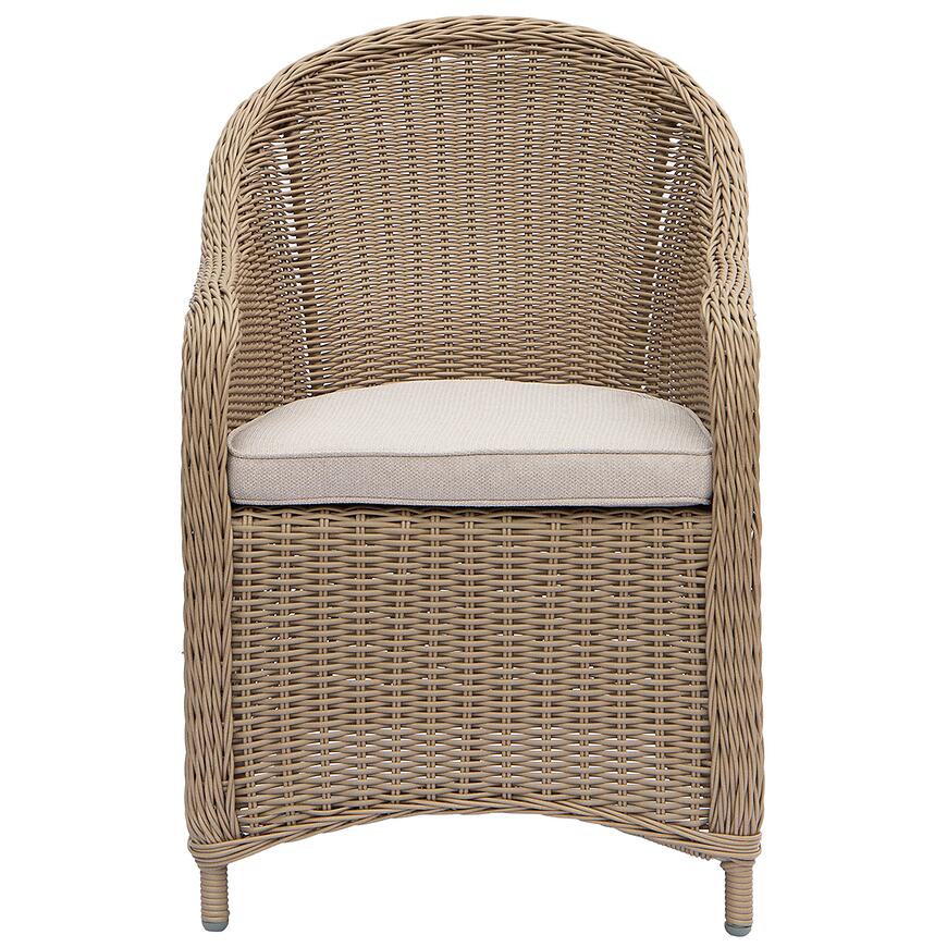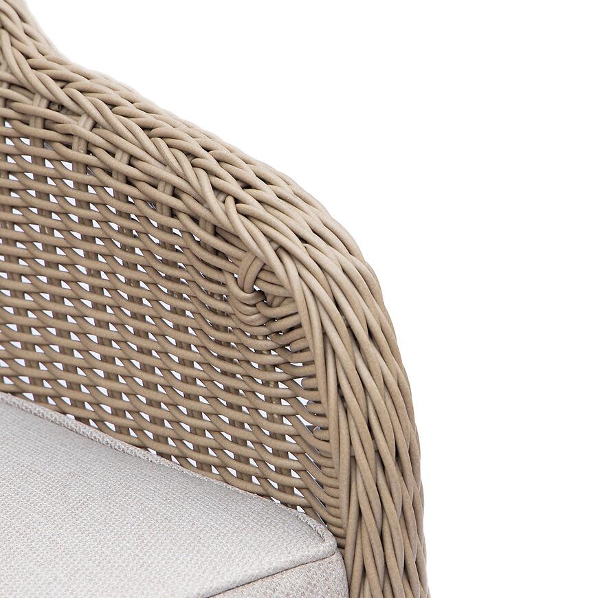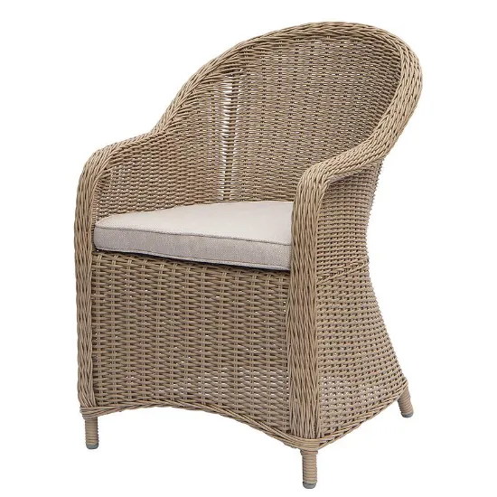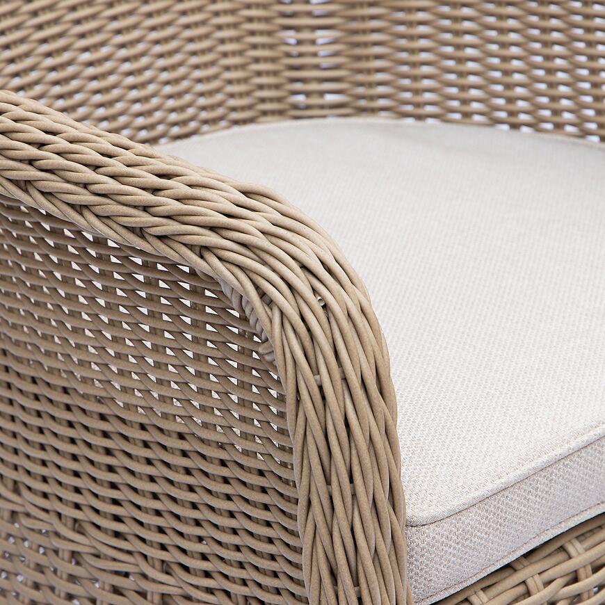 Siedzisko wykonane z technorattanu o półokrągłym splocie nie tylko dobrze wygląda, ale także zapewnia komfort użytkowania. Krzesło posiada praktyczne podłokietniki, które zwiększają wygodę podczas odpoczynku. W zestawie znajduje się również miękka poduszka w kolorze beżowym, wykonana z poliestru i wypełniona pianką, co sprawia, że nawet dłuższe chwile relaksu są przyjemniejsze.
