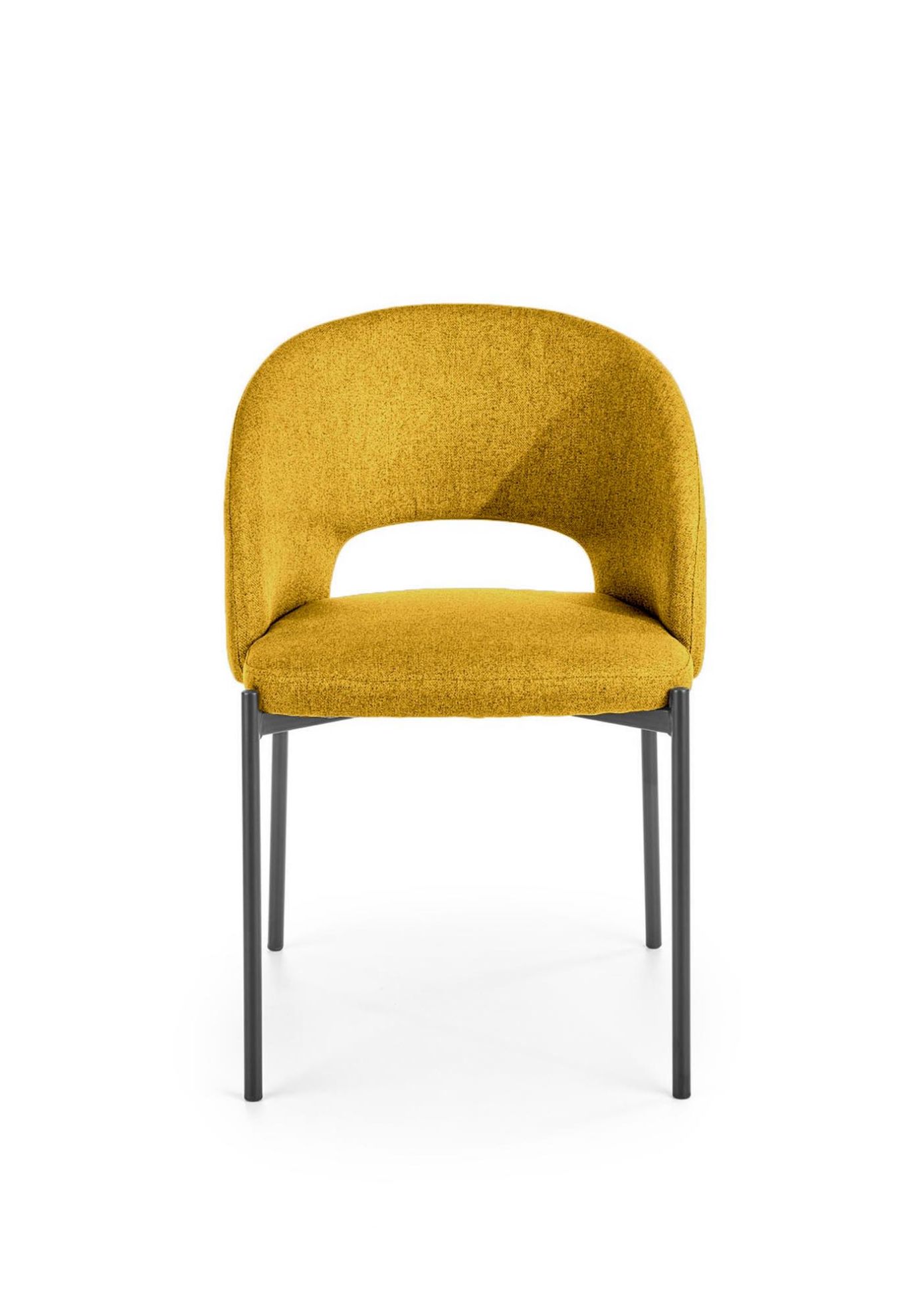 Siedzisko oraz oparcie krzesła obite są wysokiej jakości tkaniną w modnym musztardowym kolorze, który dodaje wnętrzu ciepła i stylu. Konstrukcja krzesła opiera się na stabilnych nogach wykonanych ze stali malowanej proszkowo, co gwarantuje trwałość i nowoczesny wygląd.