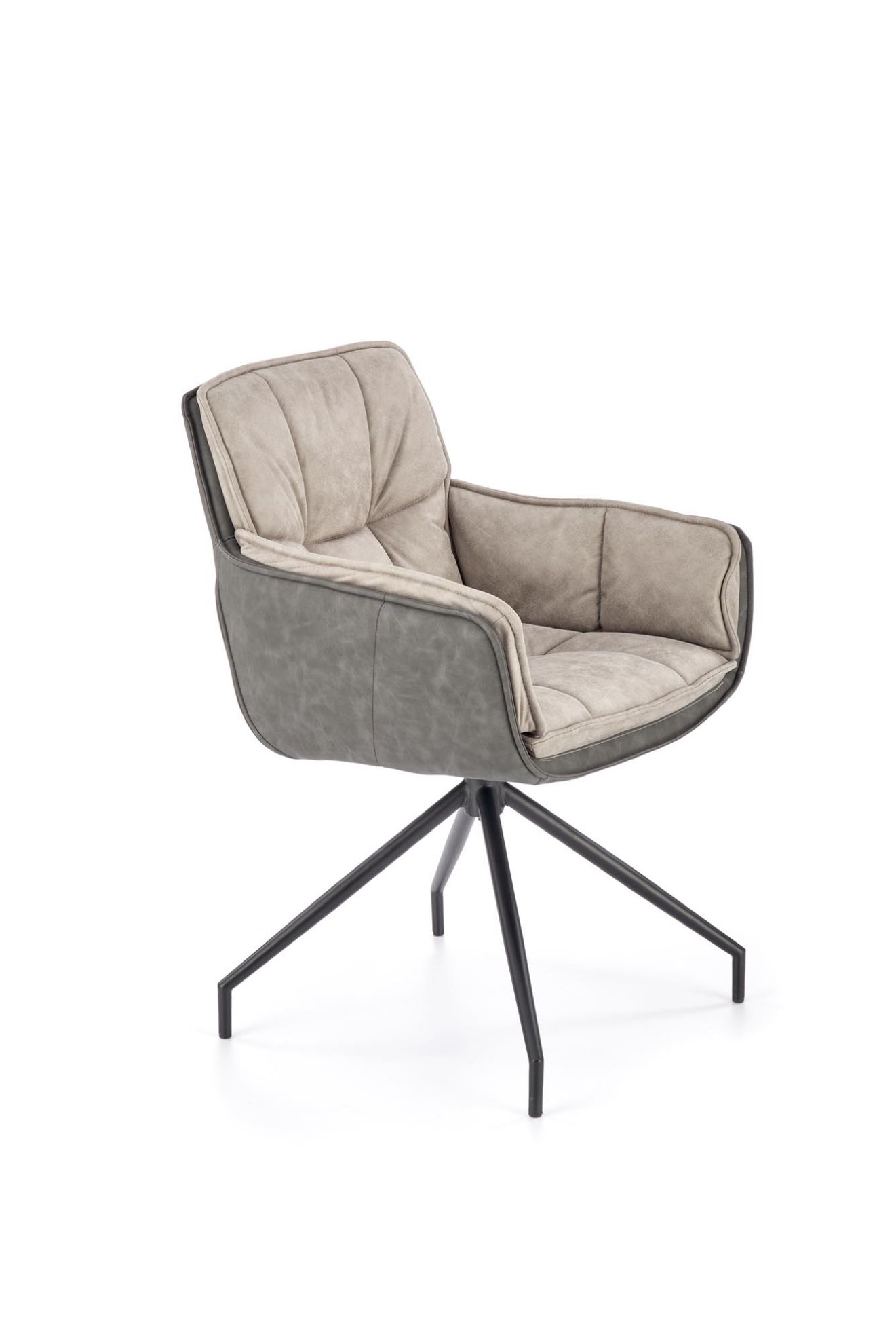Siedzisko i oparcie krzesła łączą tkaninę z ekoskórą, tworząc interesujący kontrast kolorystyczny i teksturalny. Połączenie kolorów nadają krzesłu elegancję i wyjątkowy charakter.