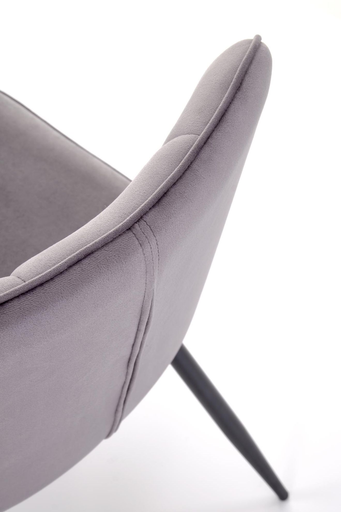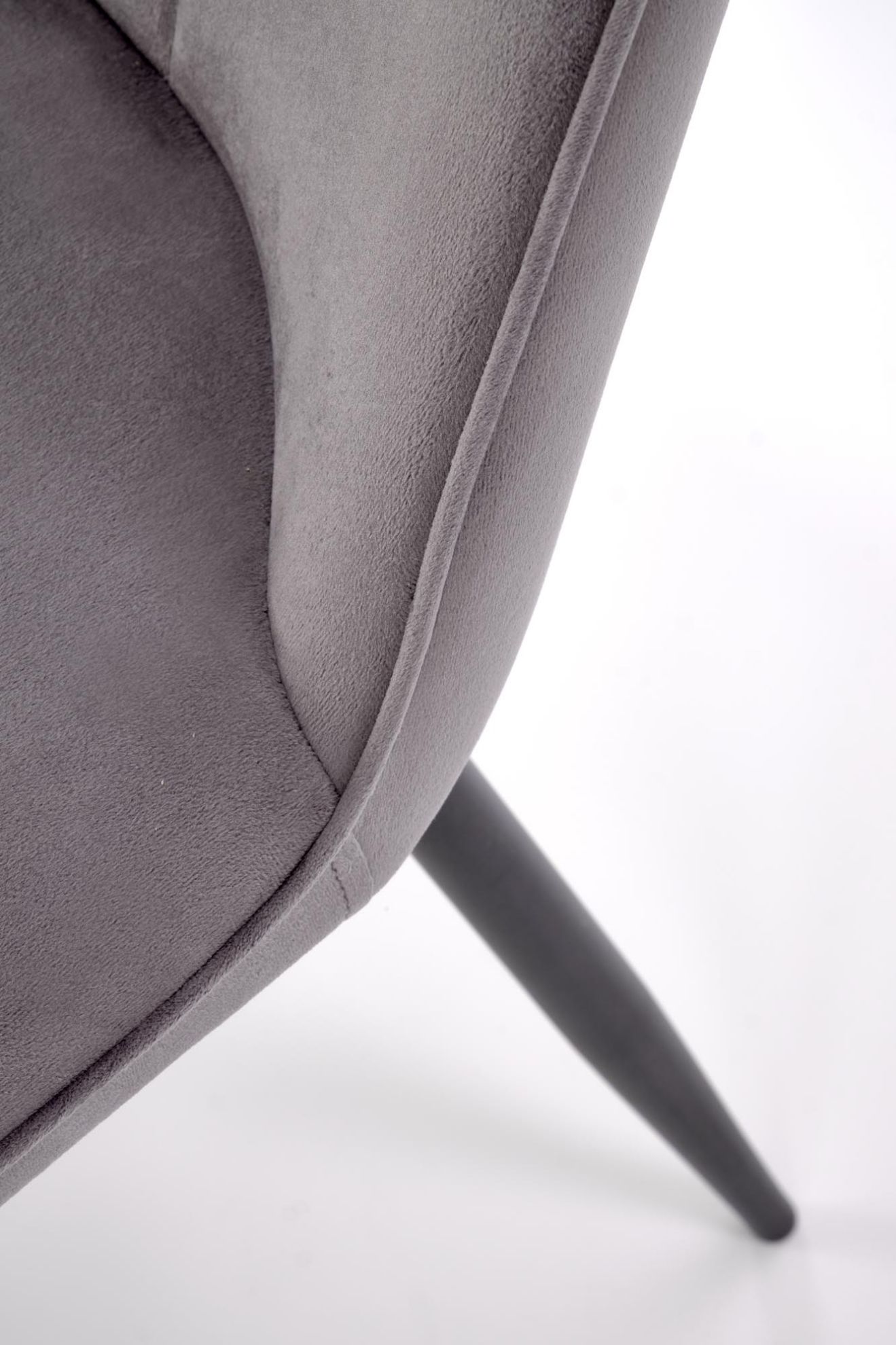 Siedzisko oraz oparcie pokryte są miękką tkaniną velvet w popielatym kolorze, która dodaje krzesłu luksusowego charakteru i elegancji. Nogi wykonane ze stali malowanej proszkowo gwarantują trwałość i stabilność, a ich nowoczesny design idealnie współgra z welurowym obiciem, tworząc harmonijną całość.