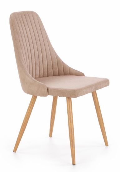 Krzesło w klasycznym, eleganckim stylu w kolorze beżowym i ciemny popiel. Kolor tapicerki łączy się z metalowymi nogami, które mają odcień bukowy, dając krzesłu nowoczesny, ale jednocześnie przytulny wygląd. Nogi są smukłe, stabilne, idealnie kontrastując z miękką tapicerką. Oparcie jest pełne, zapewniając wygodne wsparcie dla pleców. Zostało zaprojektowane z pionowymi przeszyciami, które dodają mu elegancji i struktury, tworząc wizualne wrażenie lekkości. Krzesło dostępne jest w dwóch kolorach, co daje możliwość dopasowania do różnych wnętrz: beż oraz ciemny popiel. Dzięki tej różnorodności można łatwo dobrać krzesło do stylu pomieszczenia, czy to w jasnych tonacjach, czy bardziej stonowanych. To krzesło idealnie sprawdzi się zarówno w jadalni, jak i w przestrzeniach biurowych, gdzie komfort i estetyka są równie ważne.