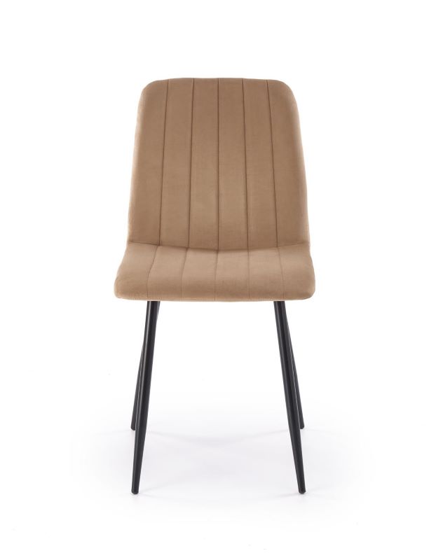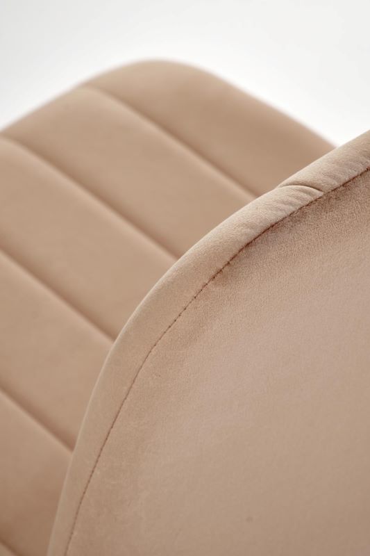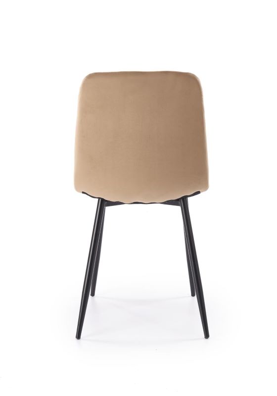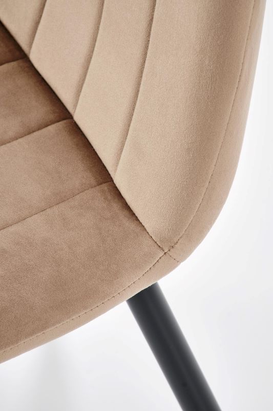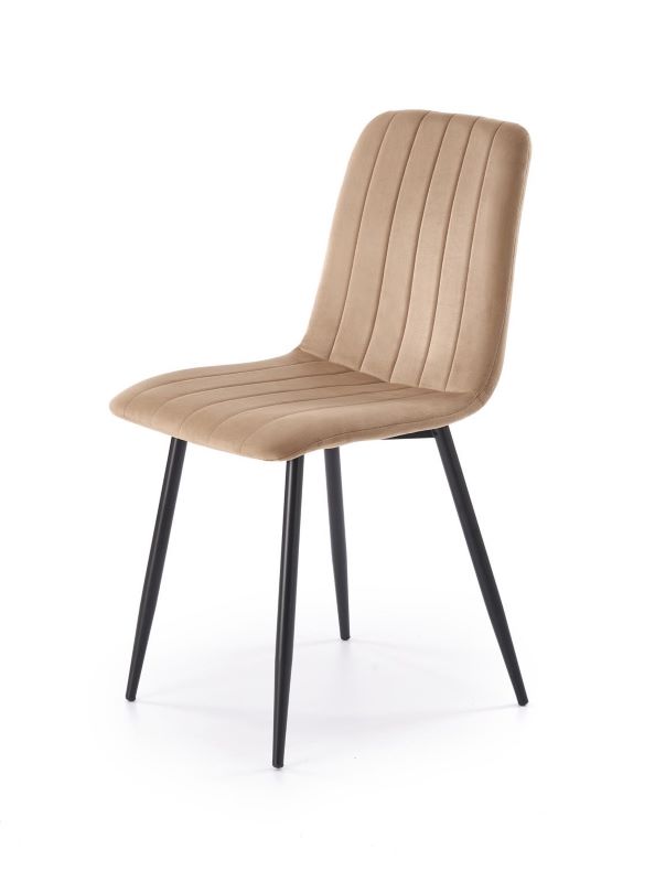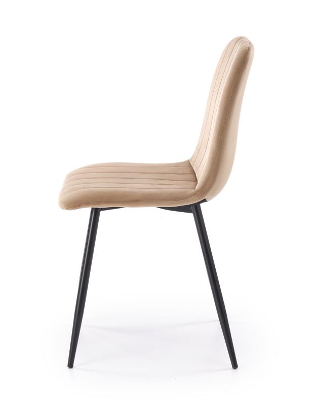 Miękkie siedzisko i oparcie obszyto wytrzymałą tkaniną typu Bluvel w kolorze beżowym. Siedzisko i oparcie od wewnątrz posiada ozdobne pionowe przeszycia. Tył krzesła jest gładki. Podstawa krzesła to cztery metalowe nogi malowane na czarny matowy kolor. Krzesło jest niewielkich rozmiarów dlatego idealnie wpisze się w aranżację małej jadalni. Występuje w kilku modnych wariantach kolorystycznych, co ułatwia dopasowanie go do różnych stylów wnętrza.