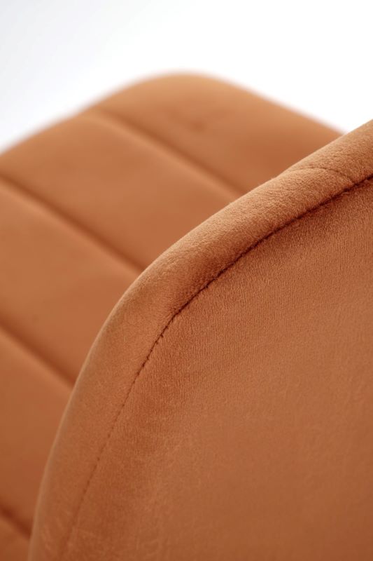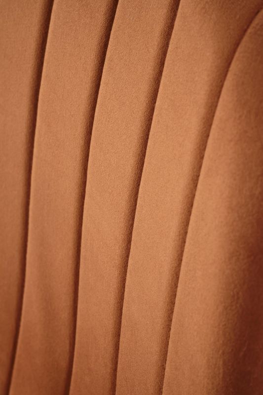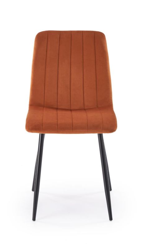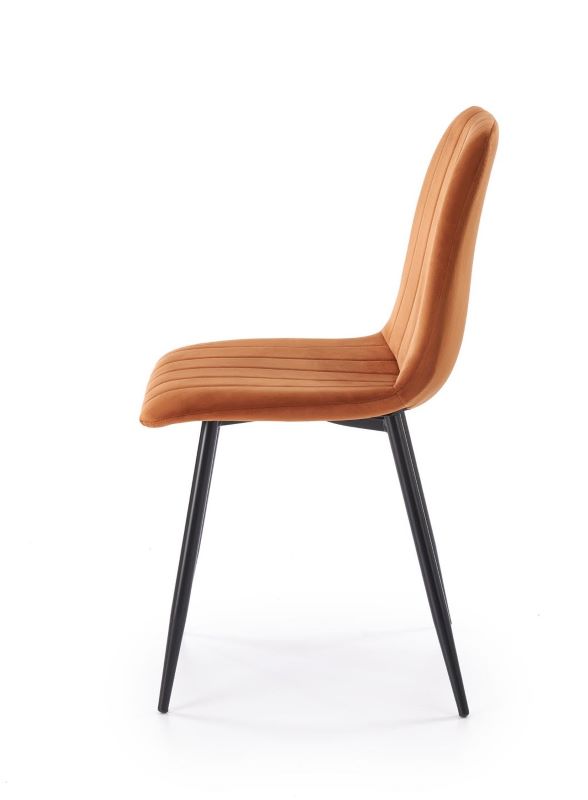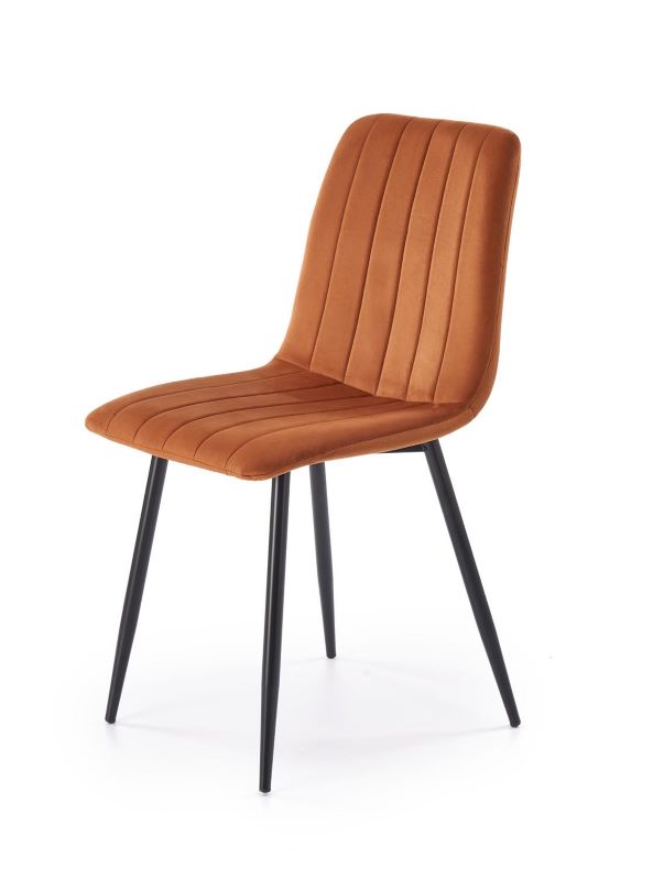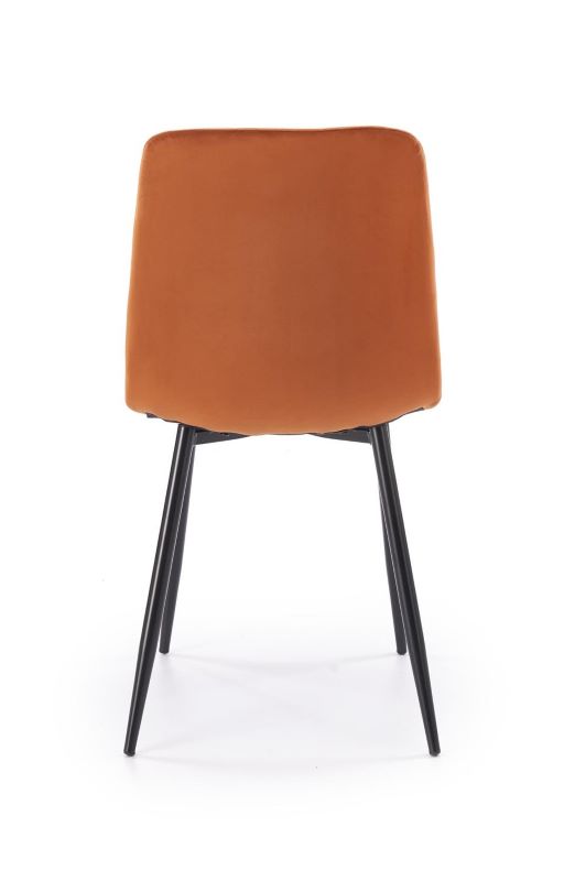 Miękkie siedzisko i oparcie obszyto wytrzymałą tkaniną typu Bluvel w kolorze cynamonowym. Siedzisko i oparcie od wewnątrz posiada ozdobne pionowe przeszycia. Tył krzesła jest gładki. Podstawa krzesła to cztery metalowe nogi malowane na czarny matowy kolor. Krzesło jest niewielkich rozmiarów dlatego idealnie wpisze się w aranżację małej jadalni. Występuje w kilku modnych wariantach kolorystycznych, co ułatwia dopasowanie go do różnych stylów wnętrza.
