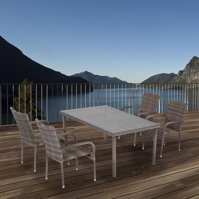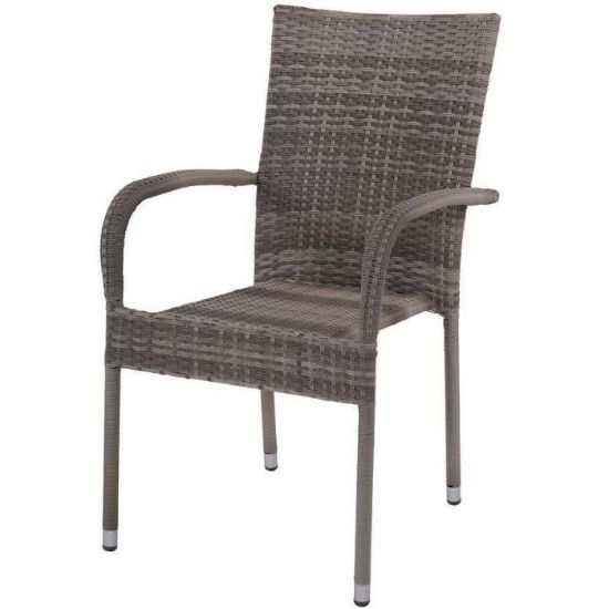 Materiał wykonania to technorattan i metal, wiec łatwo utrzymać je w czystości. Nogi krzesła zostały oplecione aluminiowa obręczą aby technorattan nie niszczył się w warunkach ogrodowych.
