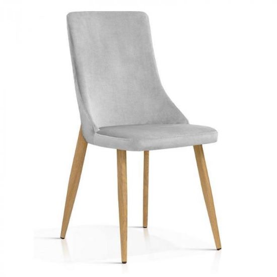 Prosta forma idealnie sprawdzi się w nowoczesnym salonie lub jadalni. Krzesło w całości tapicerowane tkaniną welurową Bluvel 03 w kolorze srebrnym, nogi wykonane z metalu w kolorze imitacj dębu. Siedzisko krzesła znajduje się na wysokości 46 cm od odłogi.