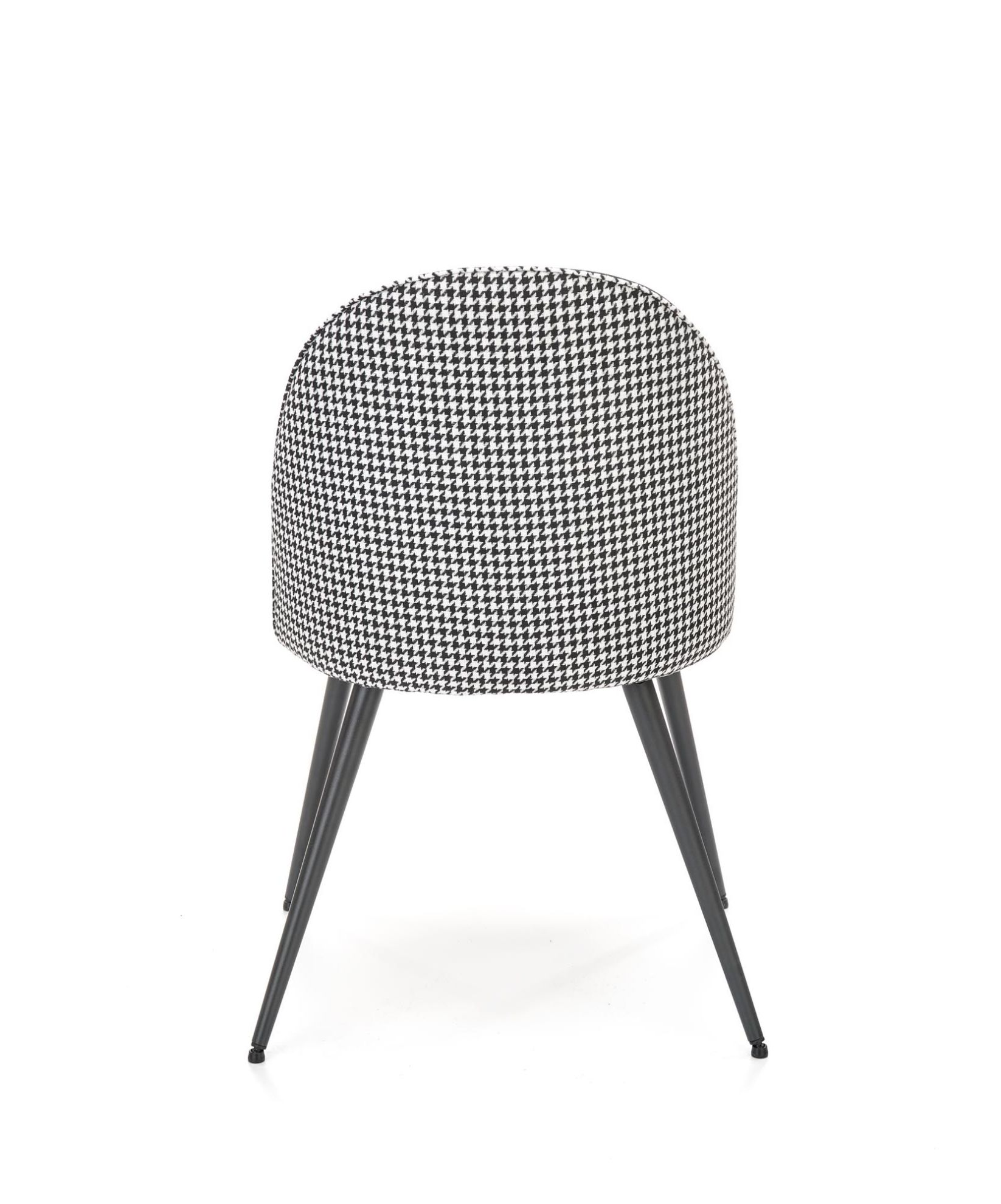 Tapicerka krzesła wykonana jest z miękkiej i przyjemnej w dotyku tkaniny w czarno/białym odcieniu. Ten subtelny kolor nadaje krzesłu wyrafinowanego charakteru i dodaje jasności pomieszczeniu. Tkanina bouclé to nie tylko elegancki wybór, ale także materiał, który dostarcza niezrównanego komfortu siedzenia.